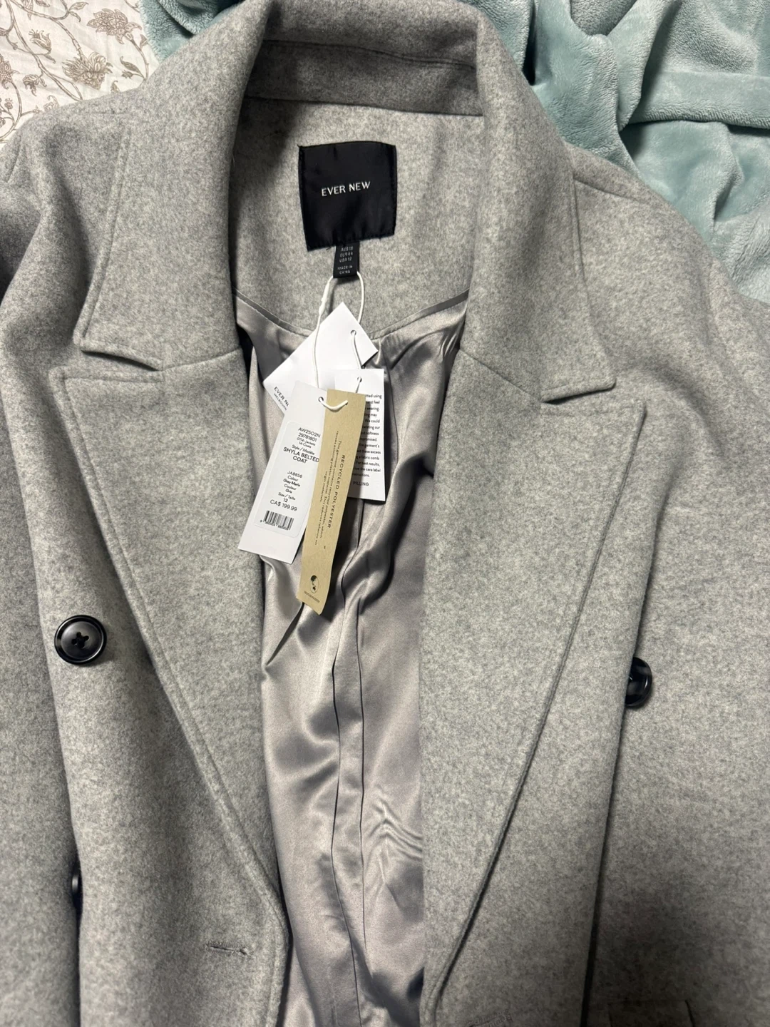 This is an Ever New double-breasted belted coat in grey. It's fully lined with a satin-like material and features two front buttons. The coat is a size 12. Its classic design makes it suitable for various occasions. NEW WITH TAGS