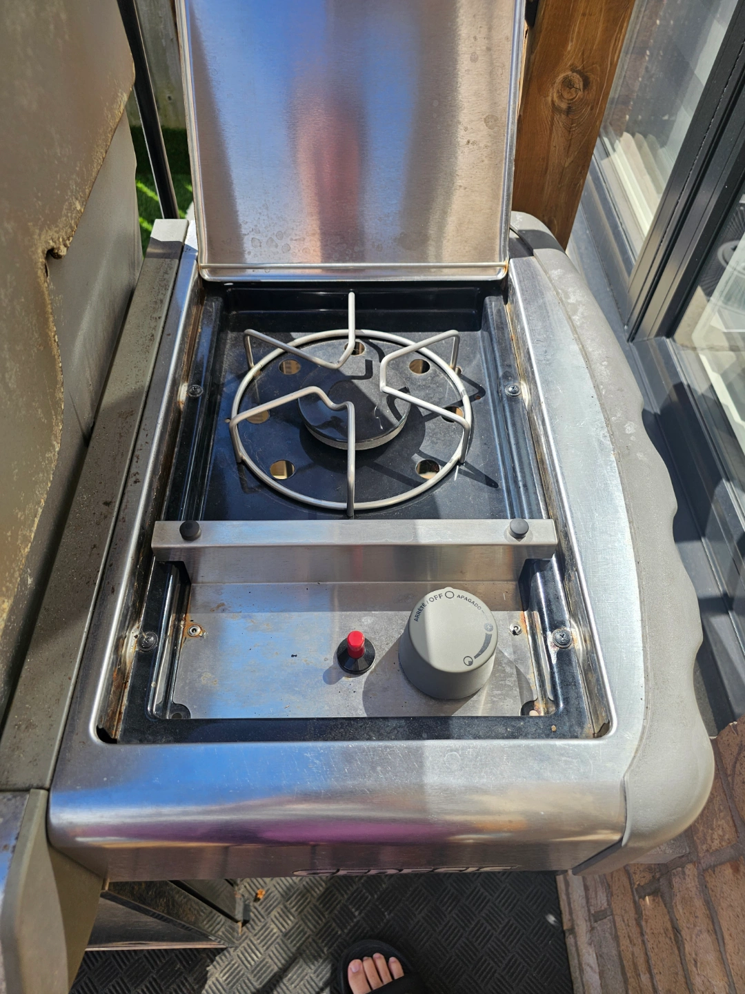 Stainless steel body. Three burners visible and sear burner.