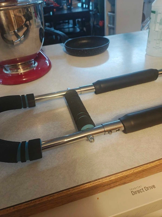 This portable device is perfect to tone your chest, arms and other parts. It's adjustable from 30-70 pounds of resistance from the push button adjuster in the pics.