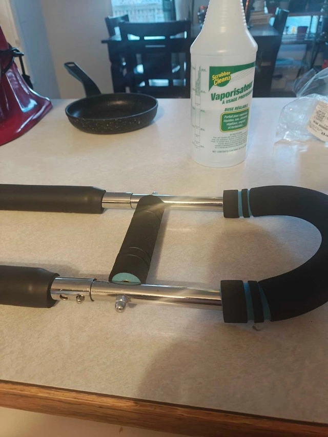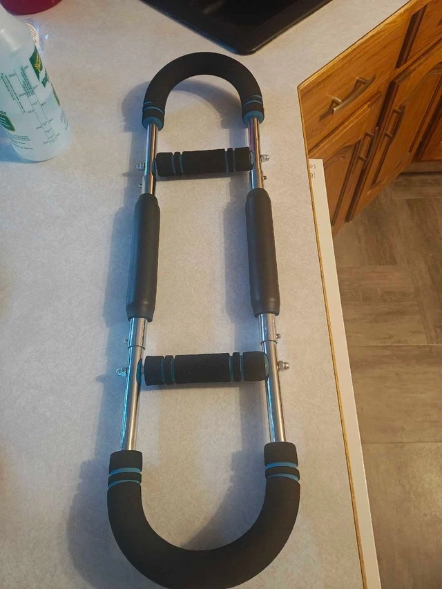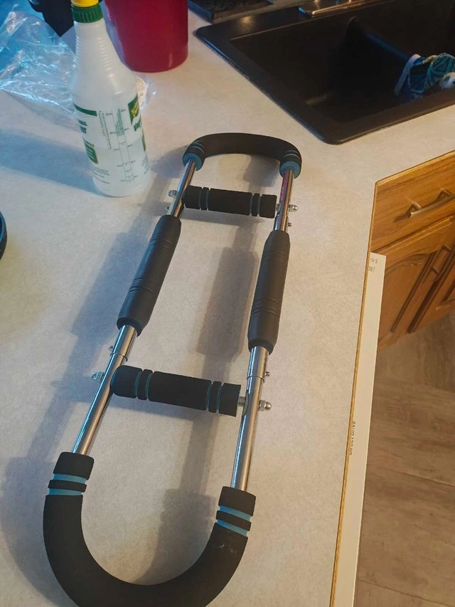 This portable device is perfect to tone your chest, arms and other parts. It's adjustable from 30-70 pounds of resistance from the push button adjuster in the pics.