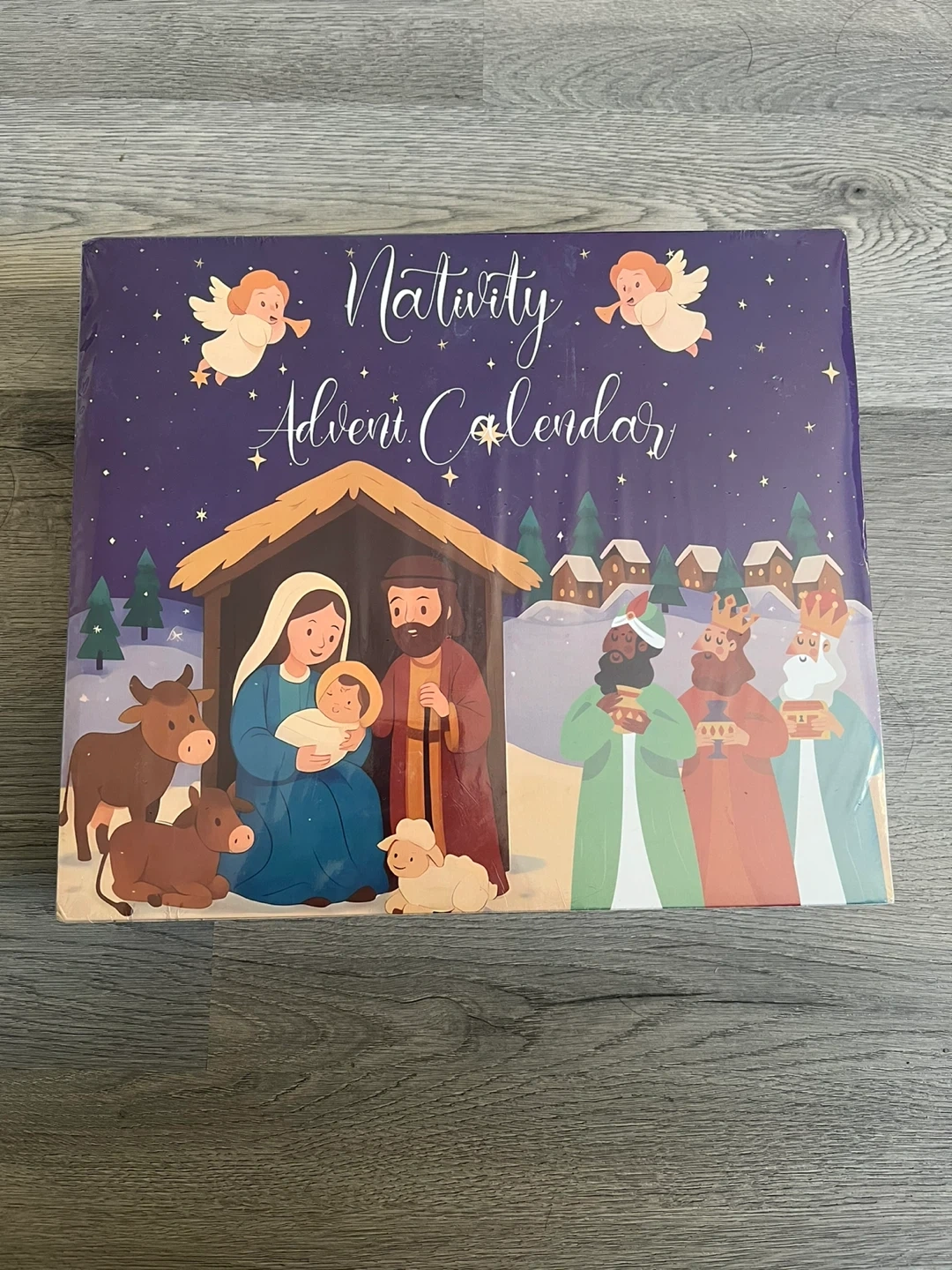 A festive nativity-themed advent calendar. Features Mary, Joseph, baby Jesus, the three wise men, and farm animals. It's perfect for counting down to Christmas!