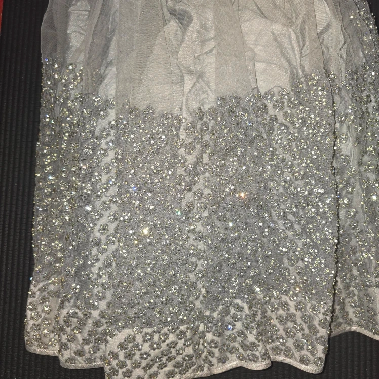 This is a beautiful silver dress with intricate embellishments. It would be perfect for a special occasion! The dress features detailed beadwork and a flattering silhouette. The material is lightweight and comfortable, making it easy to wear for extended periods. It's in great condition and ready for a new home. Got it off of fb marketplace and never wore it. Comes with top, shawl, and pants.