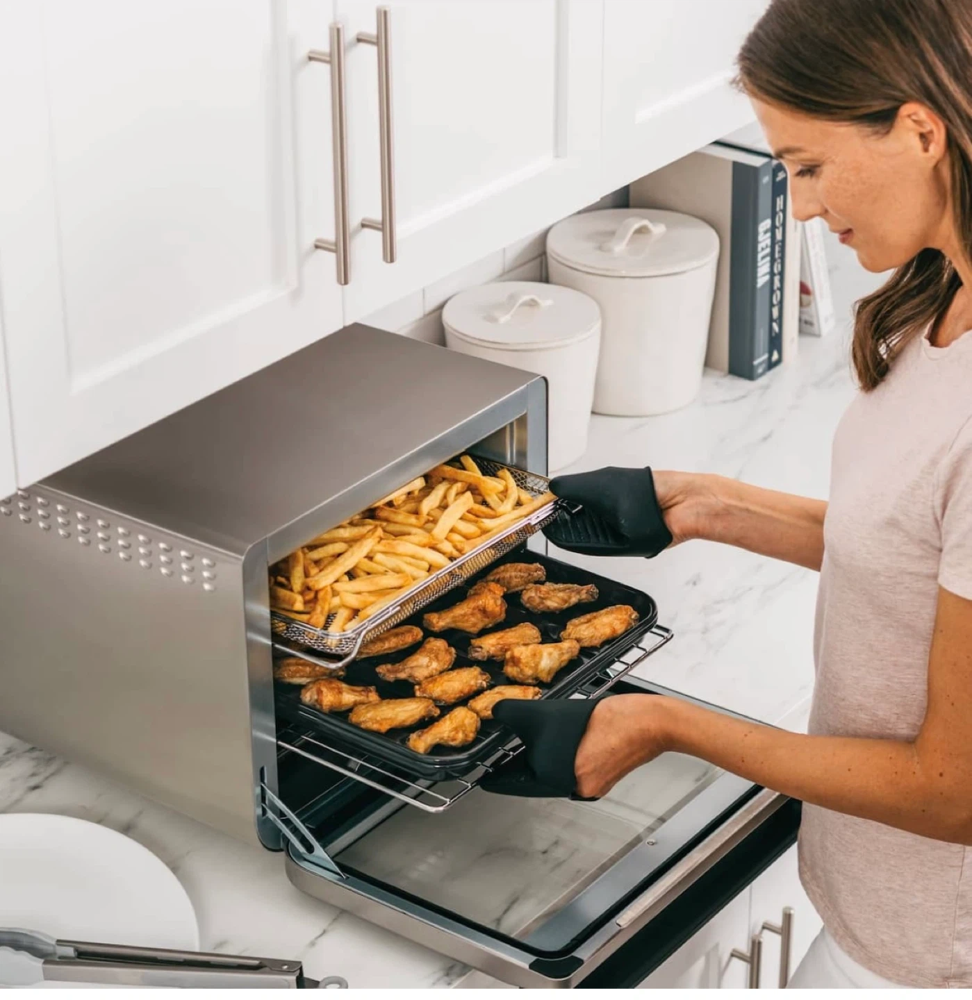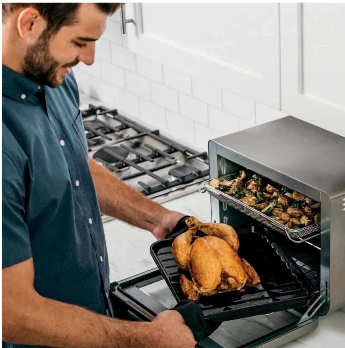 This Ninja Foodi XL Pro Digital Convection Oven air fries, bakes, roasts, and toasts. It's a versatile kitchen appliance for cooking a variety of meals. It includes a crisping basket and bake tray.