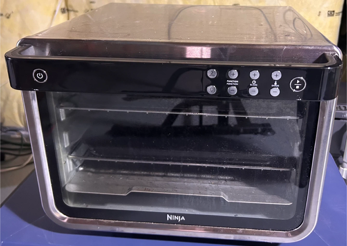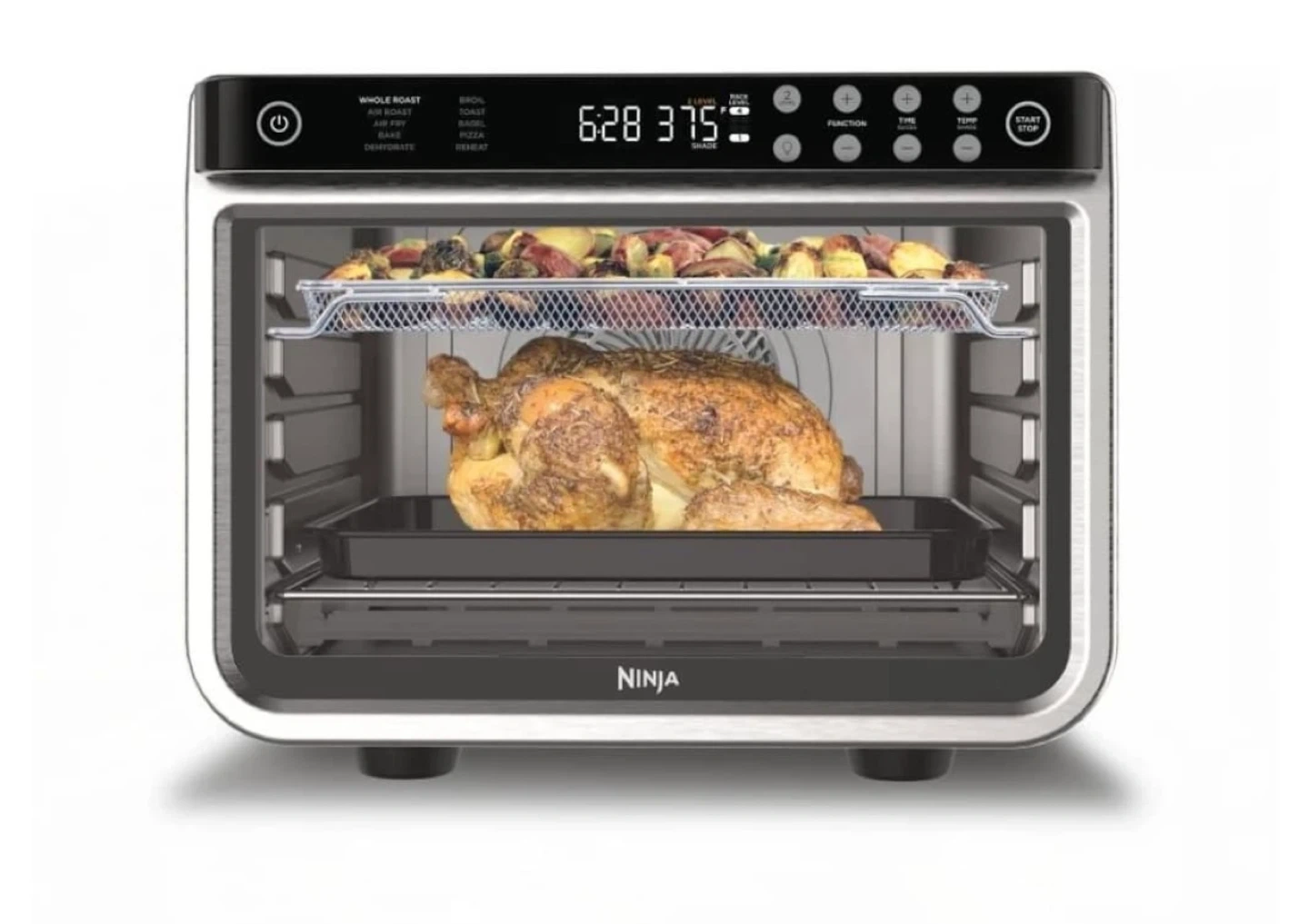 This Ninja Foodi XL Pro Digital Convection Oven air fries, bakes, roasts, and toasts. It's a versatile kitchen appliance for cooking a variety of meals. It includes a crisping basket and bake tray.