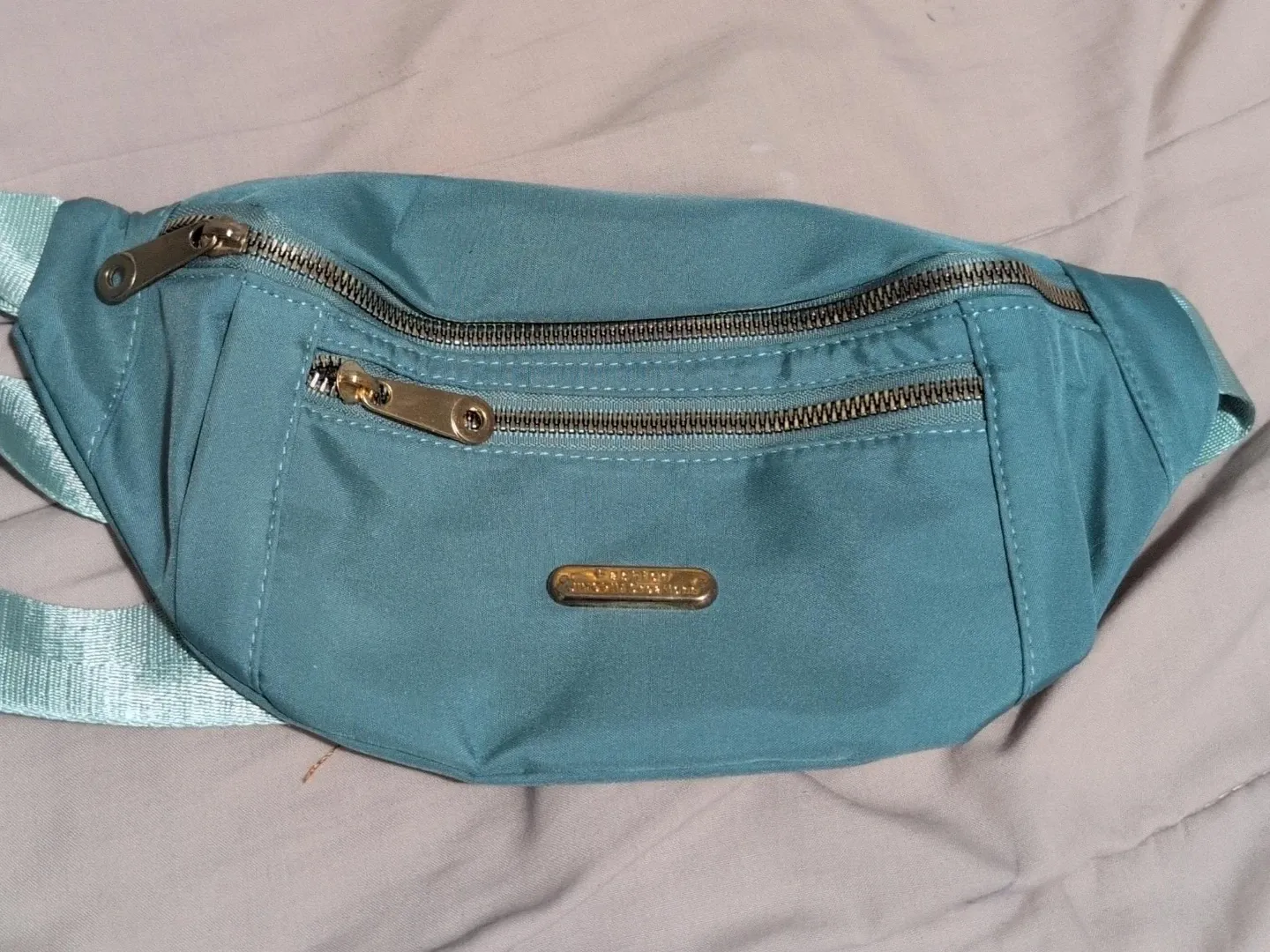 This teal fanny pack has multiple zippered pockets. It's made from a durable nylon material. This bag is great for carrying essentials while on the go! Bought on line, never use.
