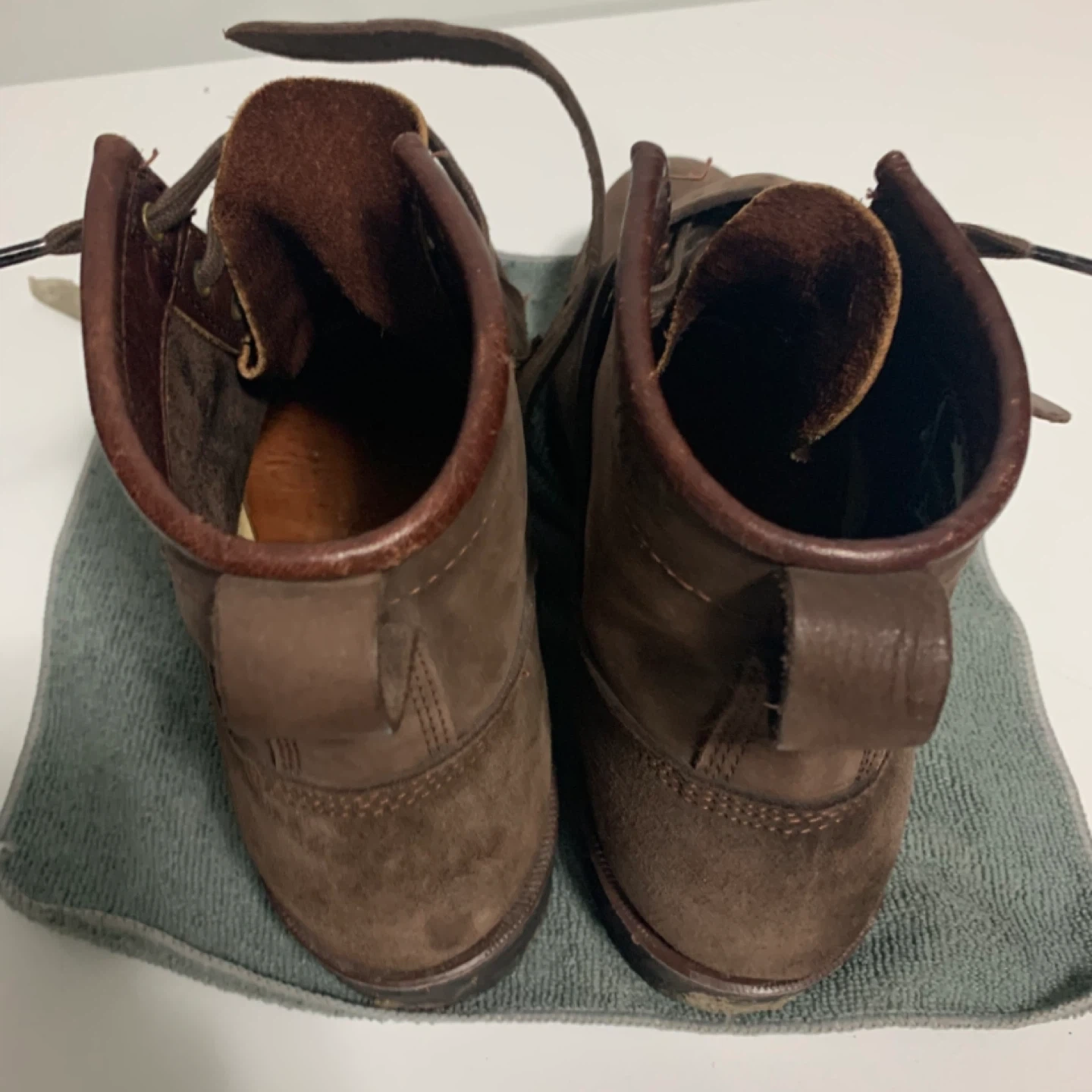 A pair of brown leather lace-up boots. These boots feature a rugged design with a side strap and buckle closure. The material appears to be a mix of smooth and suede leather.