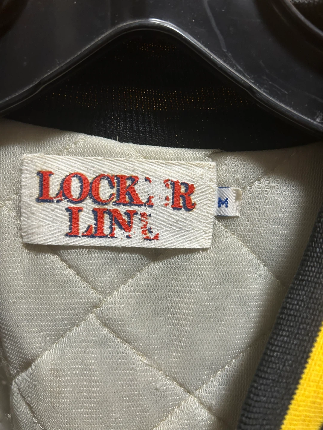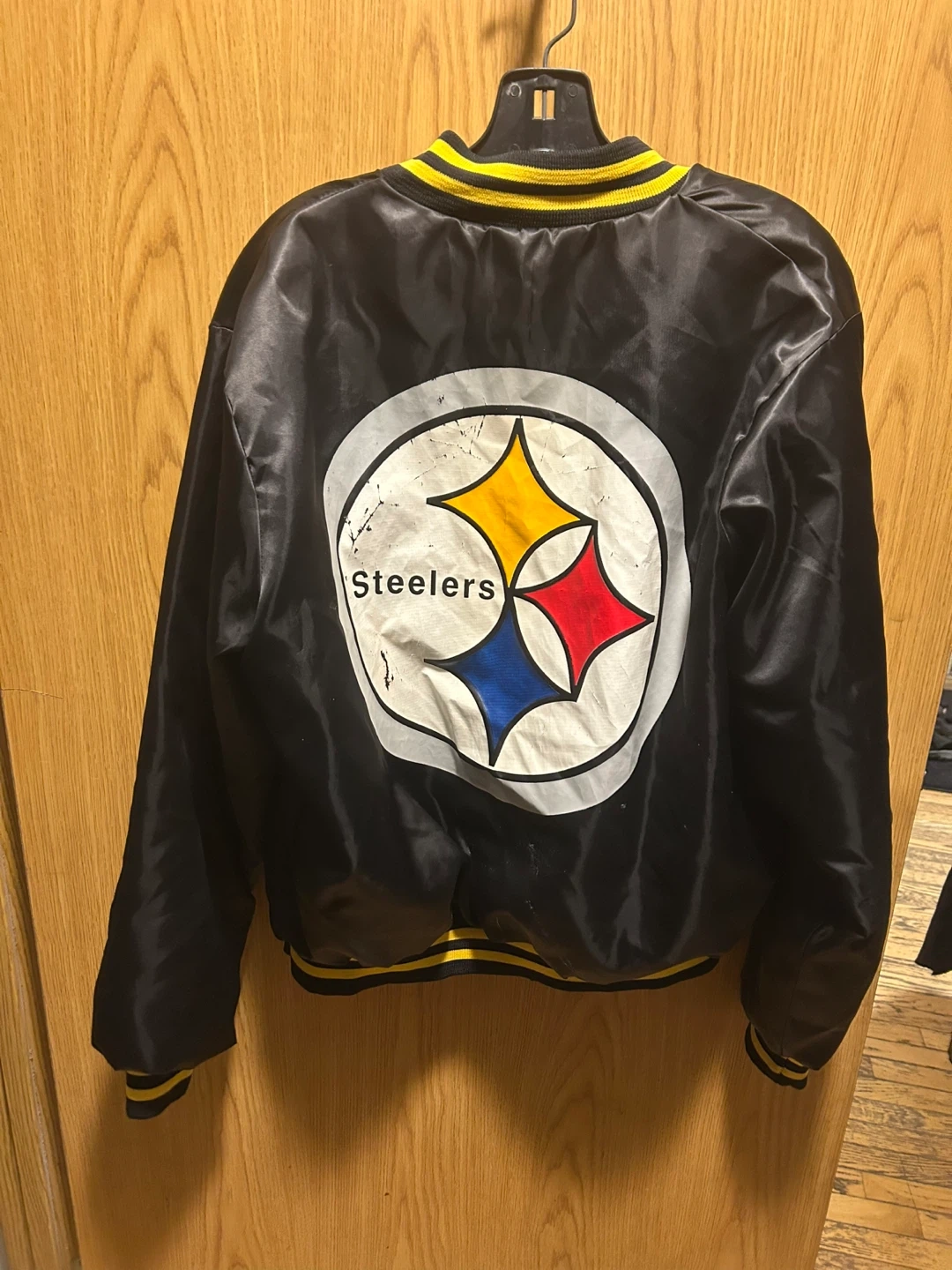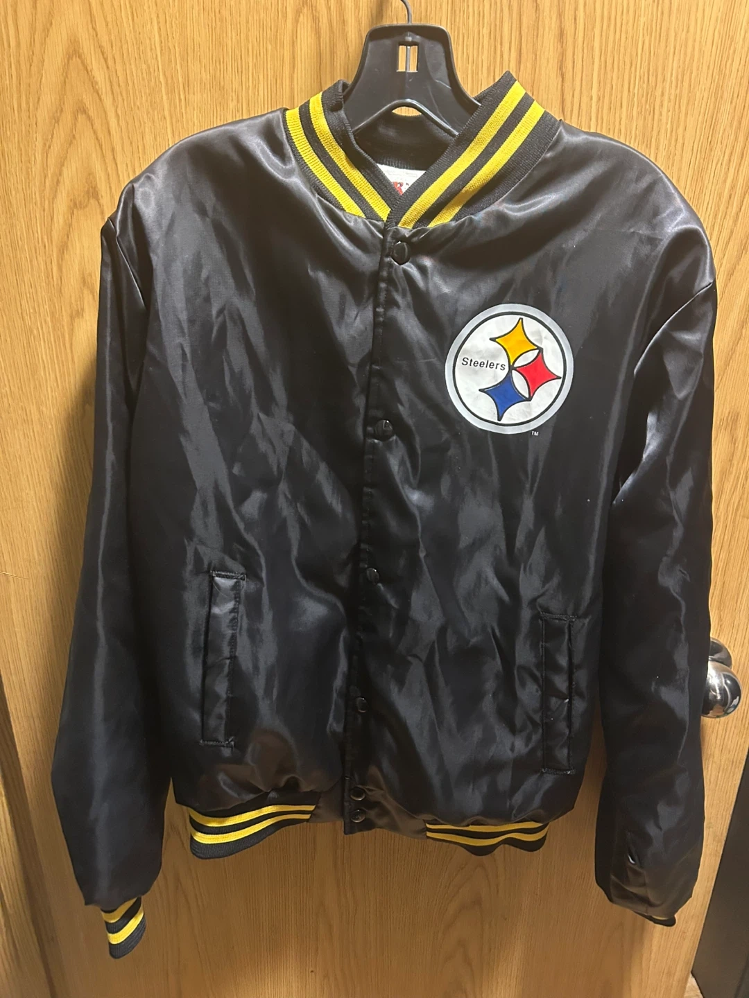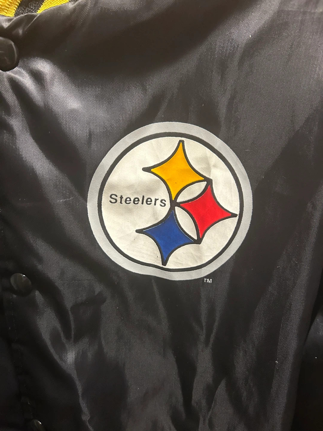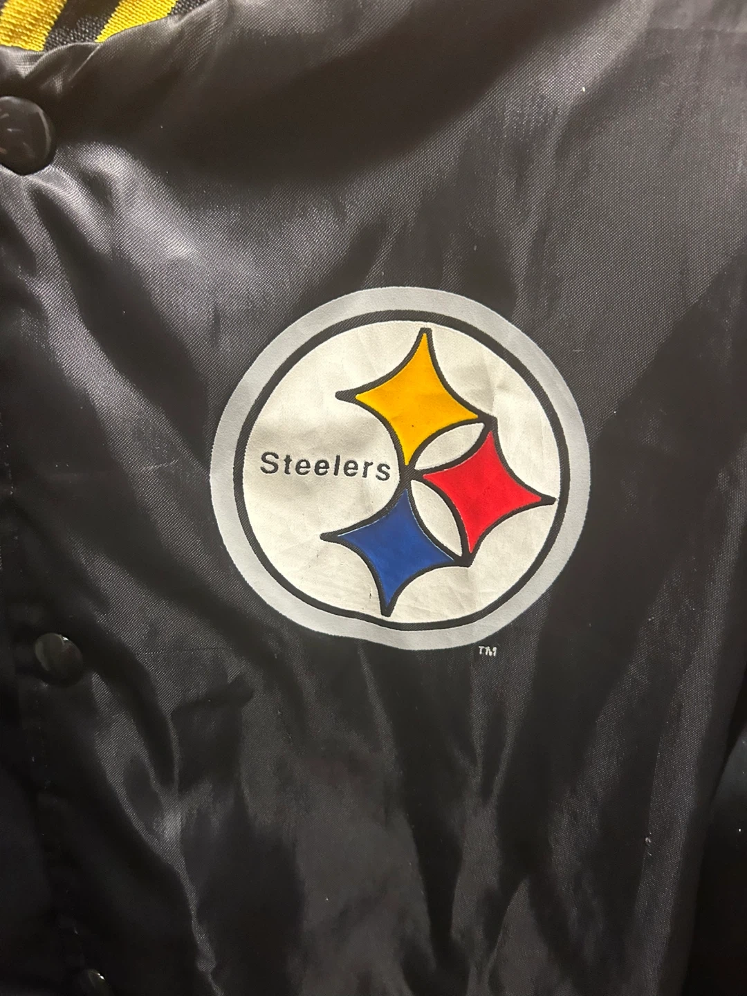 Vintage Locker Line Pittsburgh Steelers Jacket! This medium-sized, black satin jacket features the Steelers logo on both the front and back. This jacket is in used condition, showing its vintage charm.