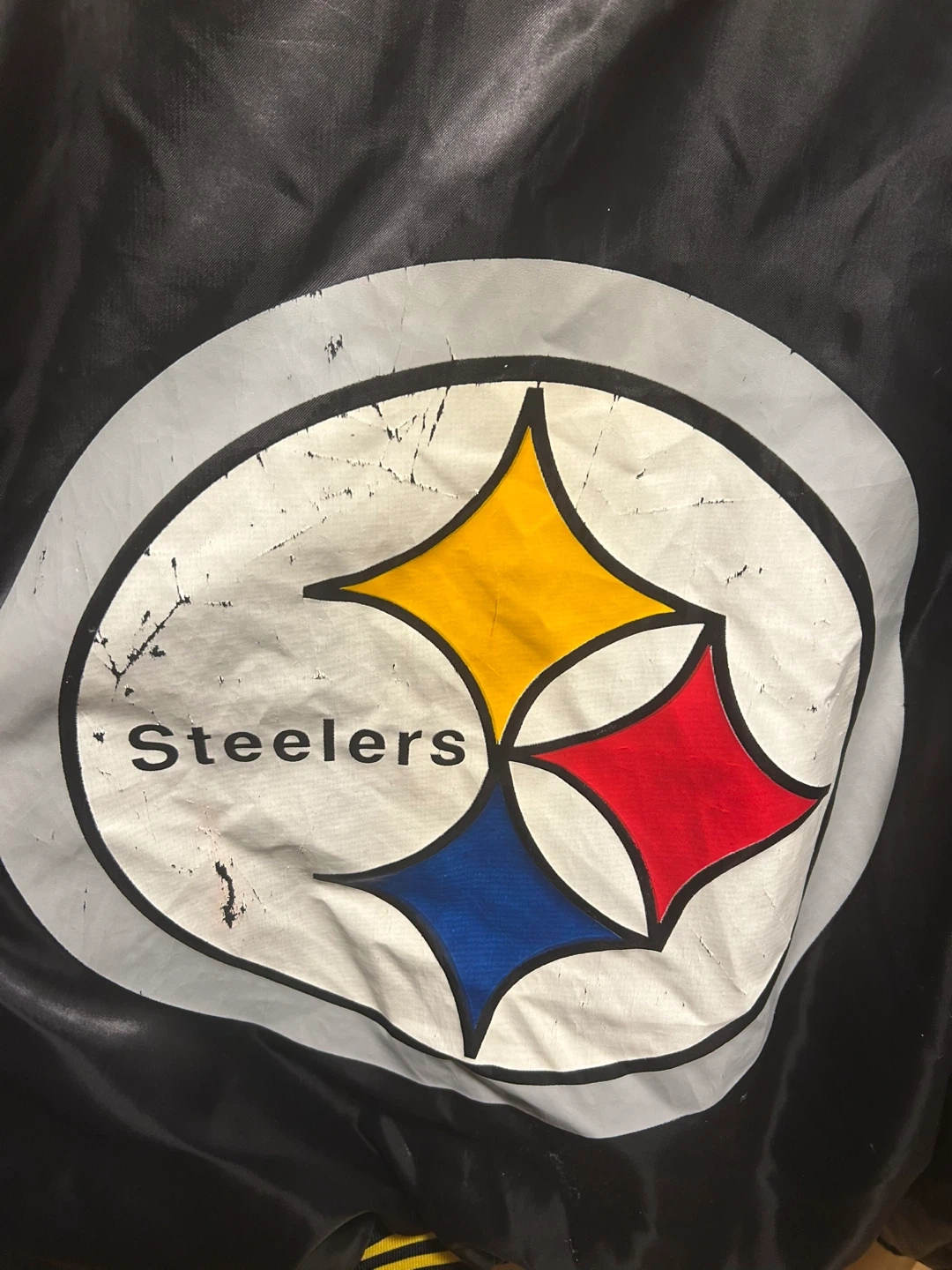 Vintage Locker Line Pittsburgh Steelers Jacket! This medium-sized, black satin jacket features the Steelers logo on both the front and back. This jacket is in used condition, showing its vintage charm.