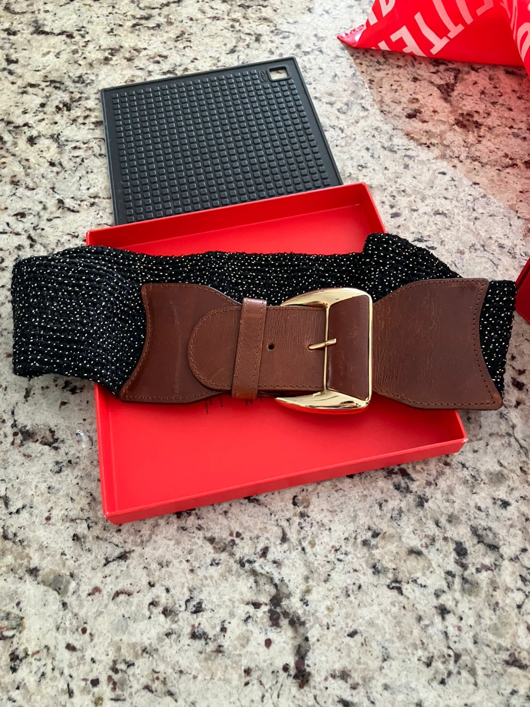 Black & Gold Dot Wide Elastic Belt with Brown Leather Detail