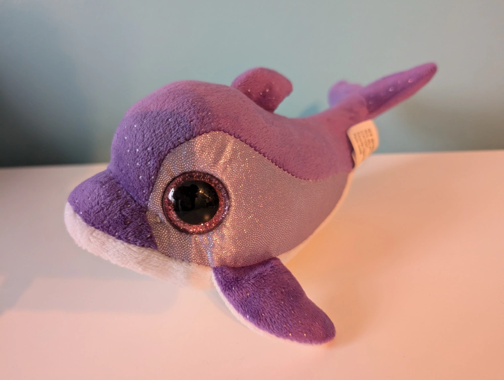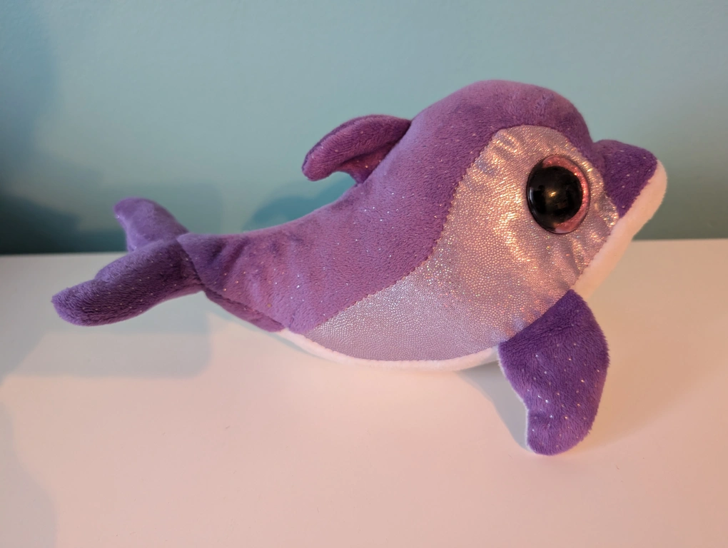 Purple plush dolphin with glitter, large eyes and white belly. Approximately 10 inches long.