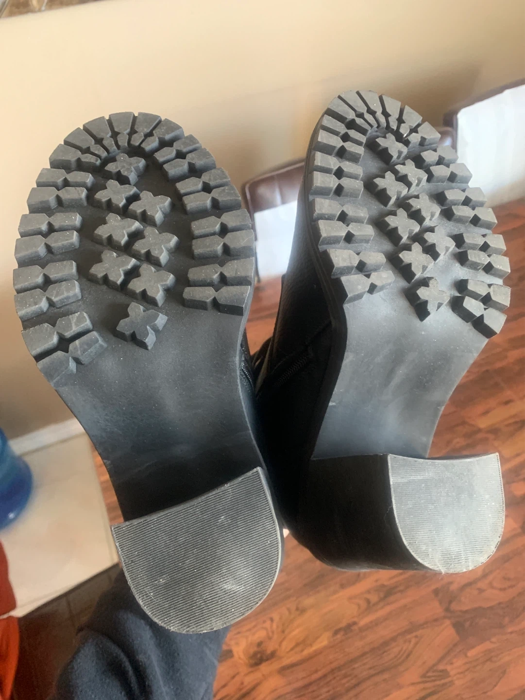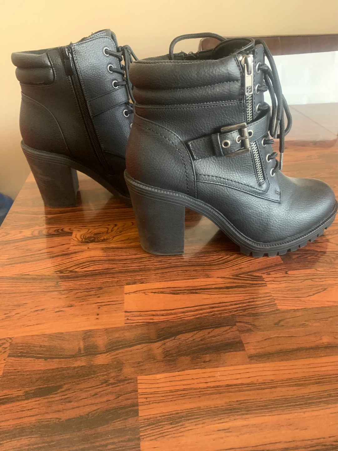 Stylish black faux leather combat boots with a chunky heel and side zipper. Features lace-up front and adjustable buckle strap. Perfect for adding an edgy touch to any outfit!
