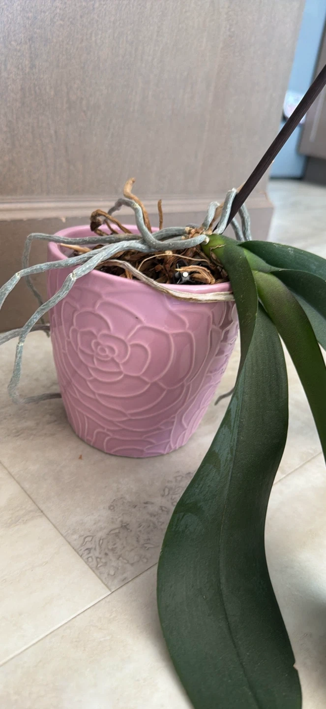 This is a healthy orchid plant. It comes in a lovely pink pot with a floral embossed design. The plant includes a support stake to keep the stem upright. Perfect for adding a touch of elegance to any room!