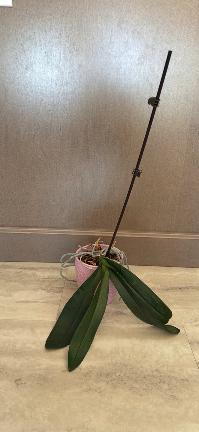 This is a healthy orchid plant. It comes in a lovely pink pot with a floral embossed design. The plant includes a support stake to keep the stem upright. Perfect for adding a touch of elegance to any room!
