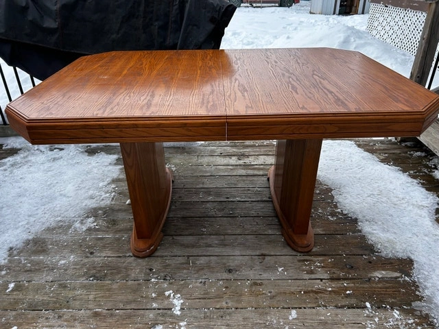 Beautiful, high-quality dining table from the renowned Waterville Furniture company (Waterville, Quebec). This is a solid, well-crafted Canadian piece built to last. Features: - Brand: Authentic Waterville Furniture (Stamp on underside) - Material: Solid Oak / Oak Veneer with a warm, natural finish - Versatile Design: Features a sturdy double-pedestal base - Extendable: Includes the original extension leaf to easily accommodate more guests. Cash accepted.