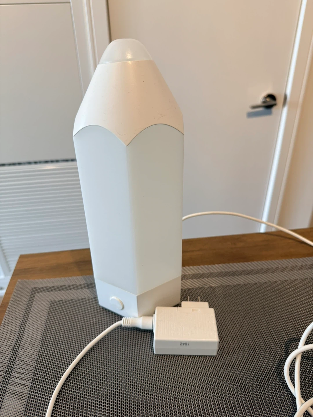 This is a fun desk lamp shaped like a pencil. It's white and comes with its power adapter. The lamp has a simple on/off button at its base. This would add a playful touch to any workspace or bedroom!