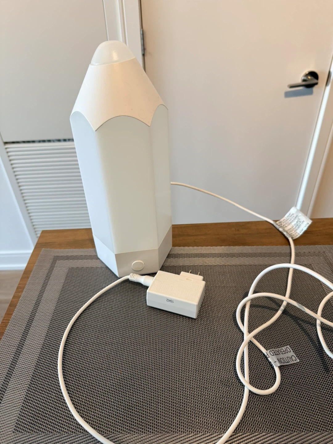 This is a fun desk lamp shaped like a pencil. It's white and comes with its power adapter. The lamp has a simple on/off button at its base. This would add a playful touch to any workspace or bedroom!
