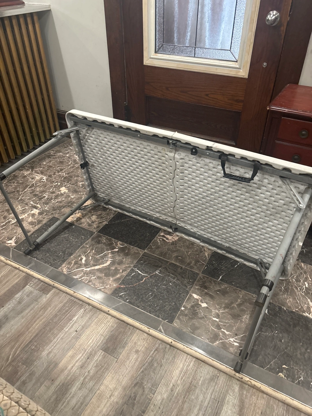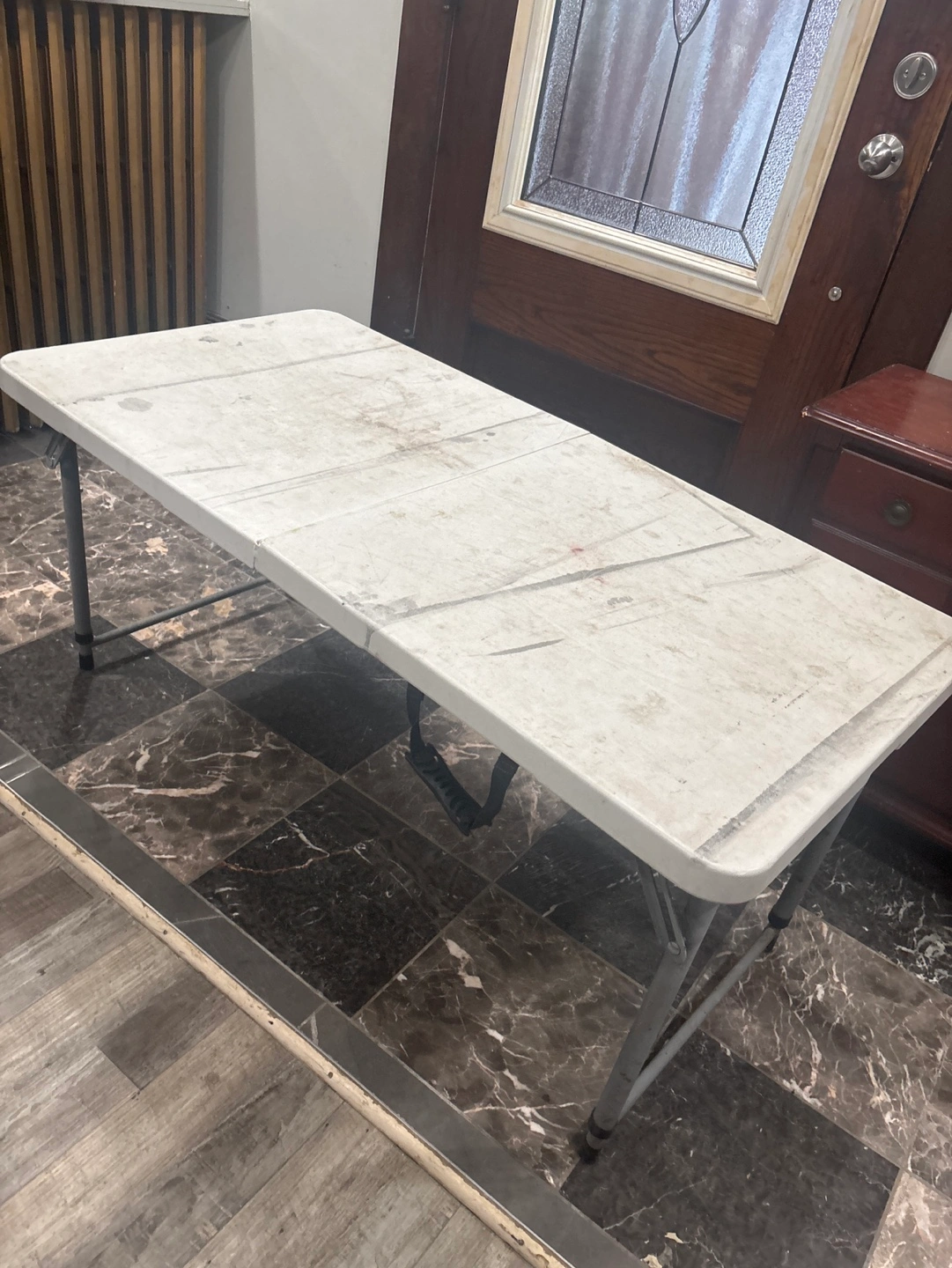 Lightweight, foldable table. Grey plastic top and metal legs. Some minor markings on the surface. Great for indoor or outdoor use.