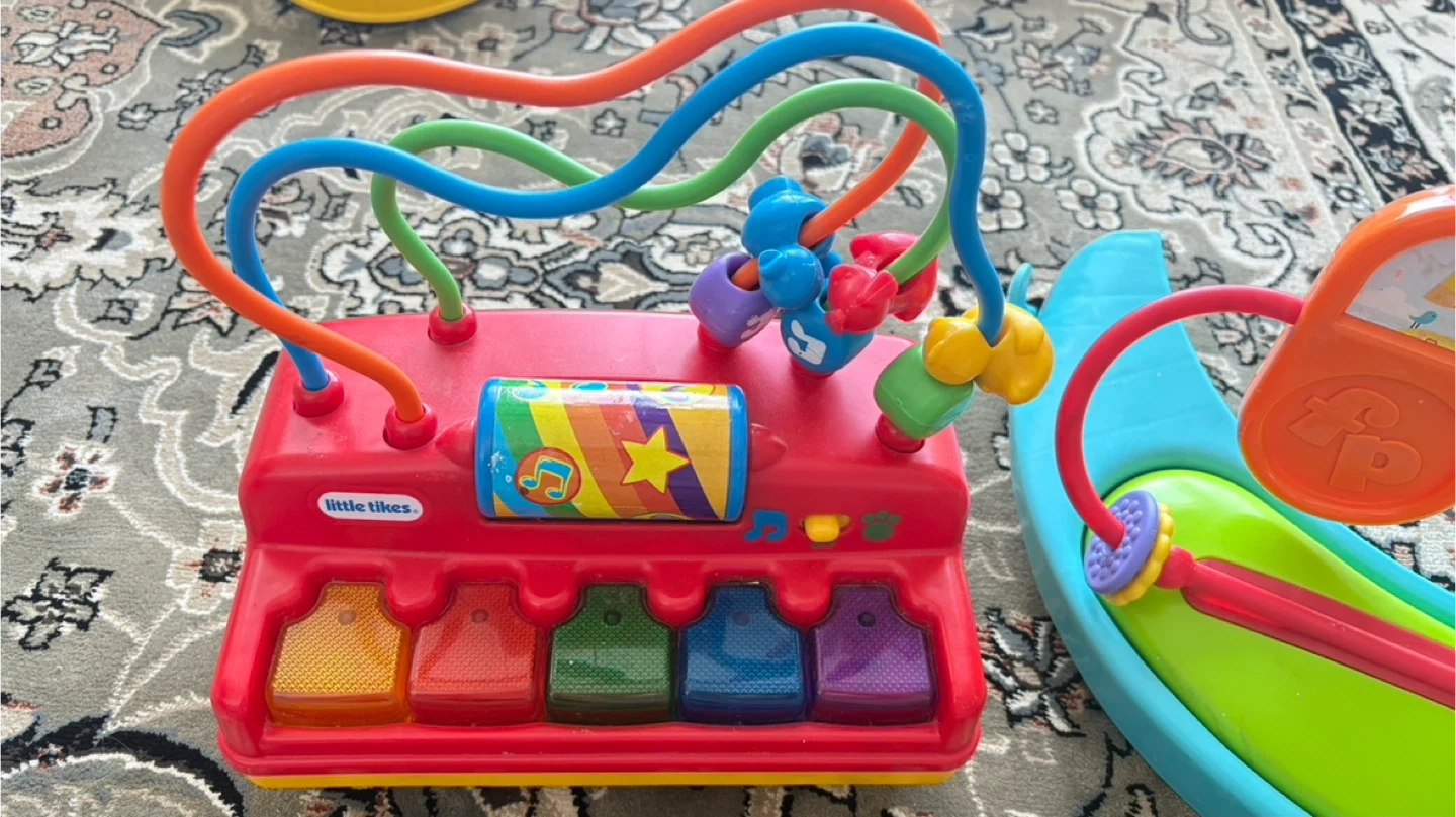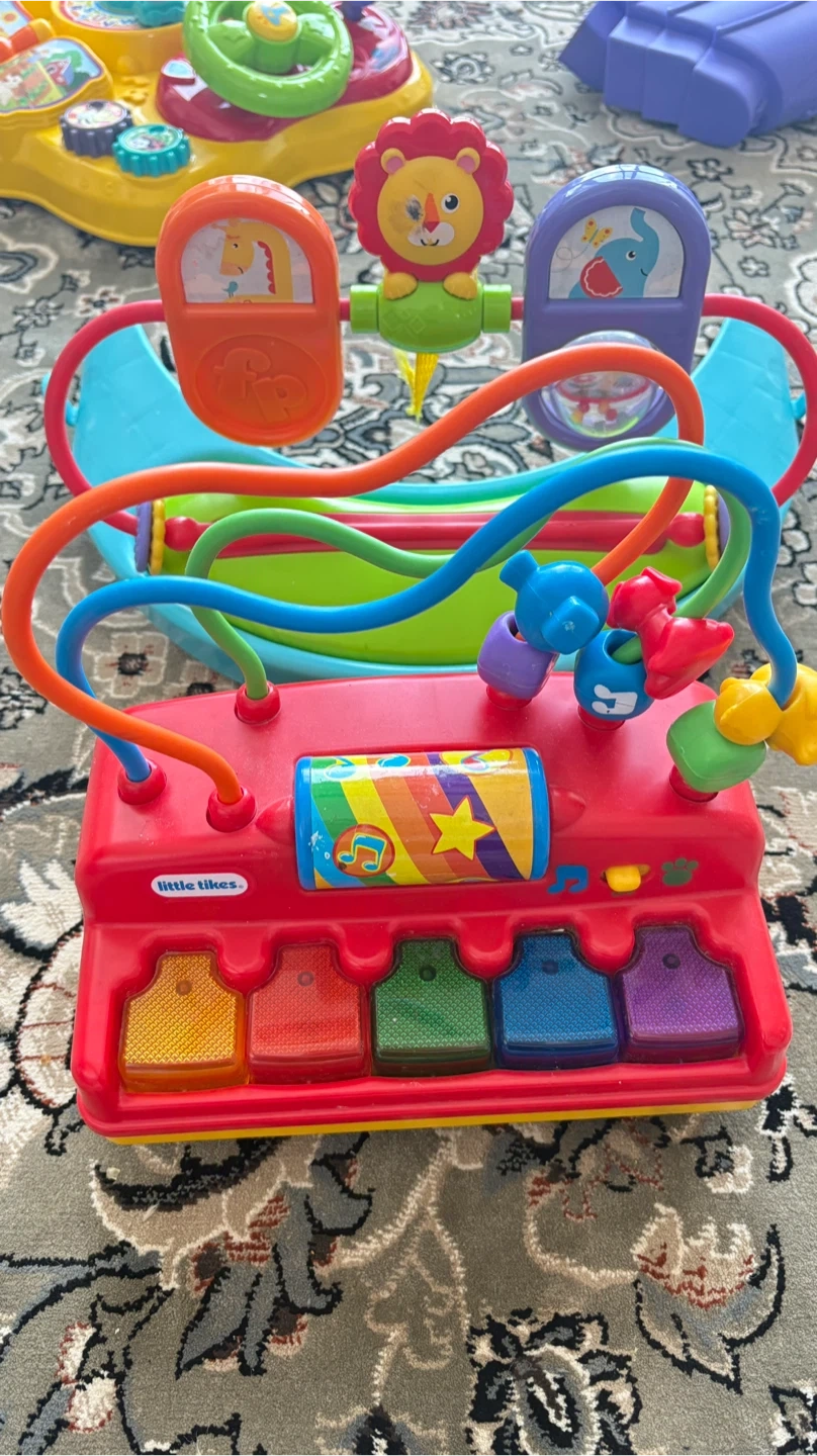 Bundle includes a Little Tikes red piano with beads and a Fisher-Price rocking toy with animal images. Great for little ones learning fine motor skills!