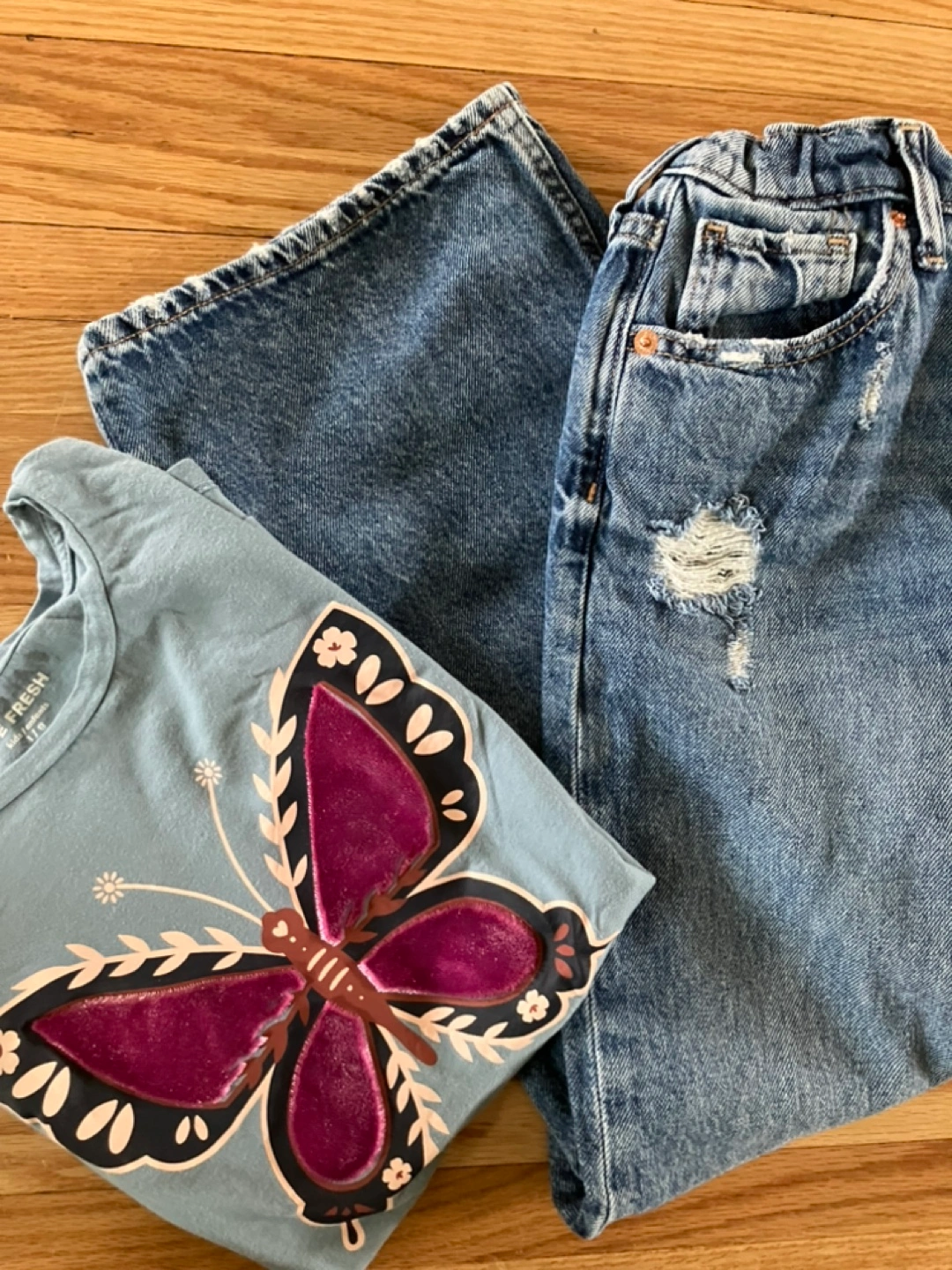 This outfit is great for school or shopping dates ποΈ Jeans are kid approved for comfort. And shirt has a beautiful butterfly on front with deep magenta velvet material. Very cool girl style!