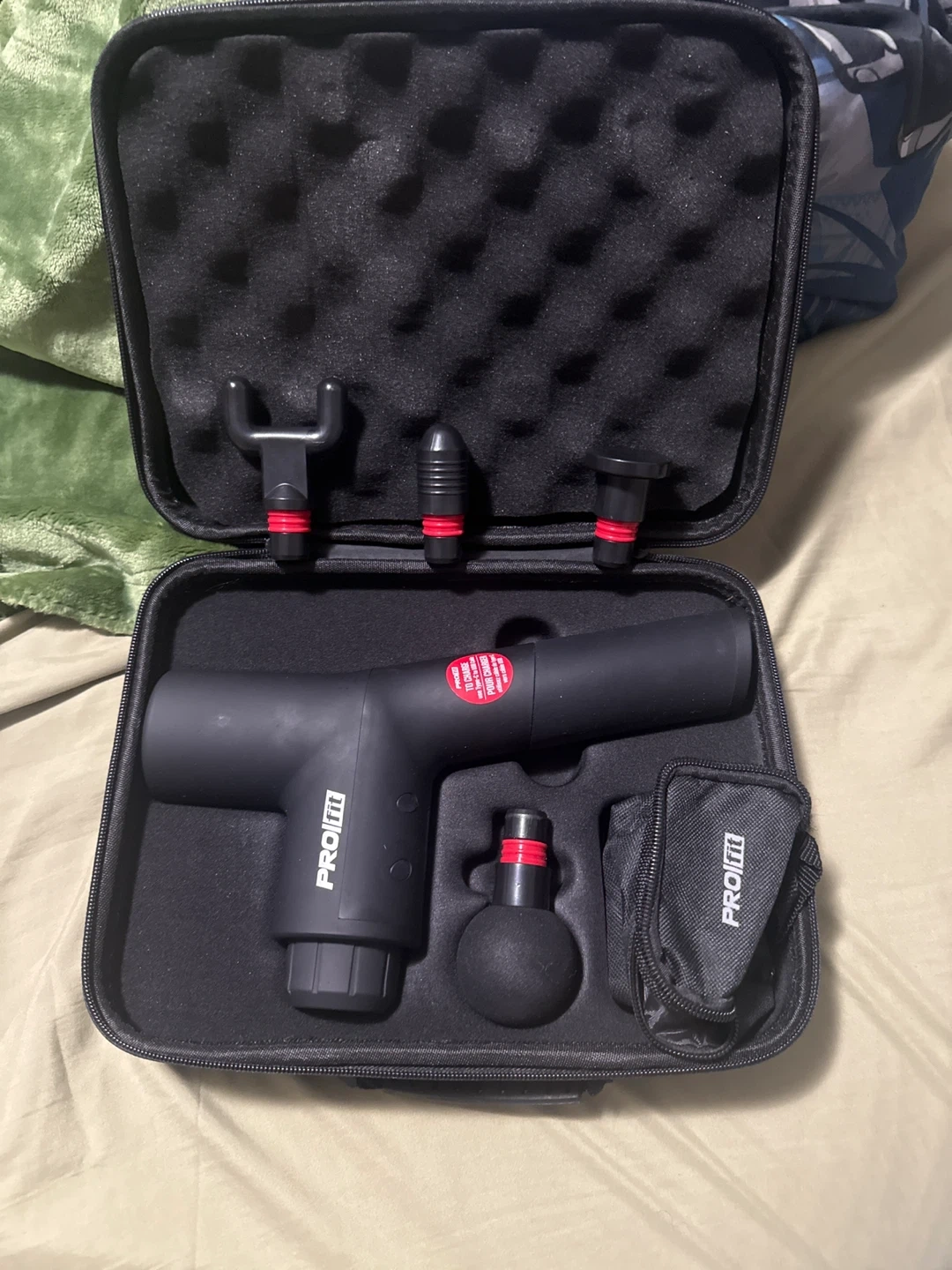 PROFIT massage gun comes with a case and multiple attachments for different muscle groups. It's designed for muscle recovery and relaxation. The kit includes the gun, charger, and various heads for targeted massage.