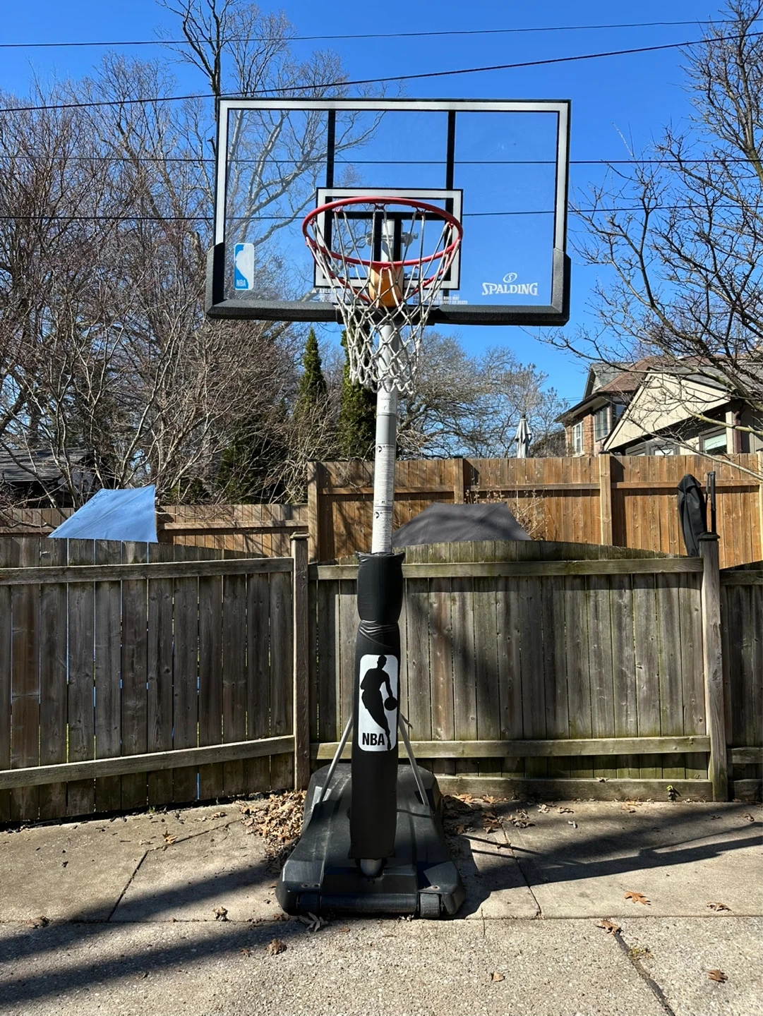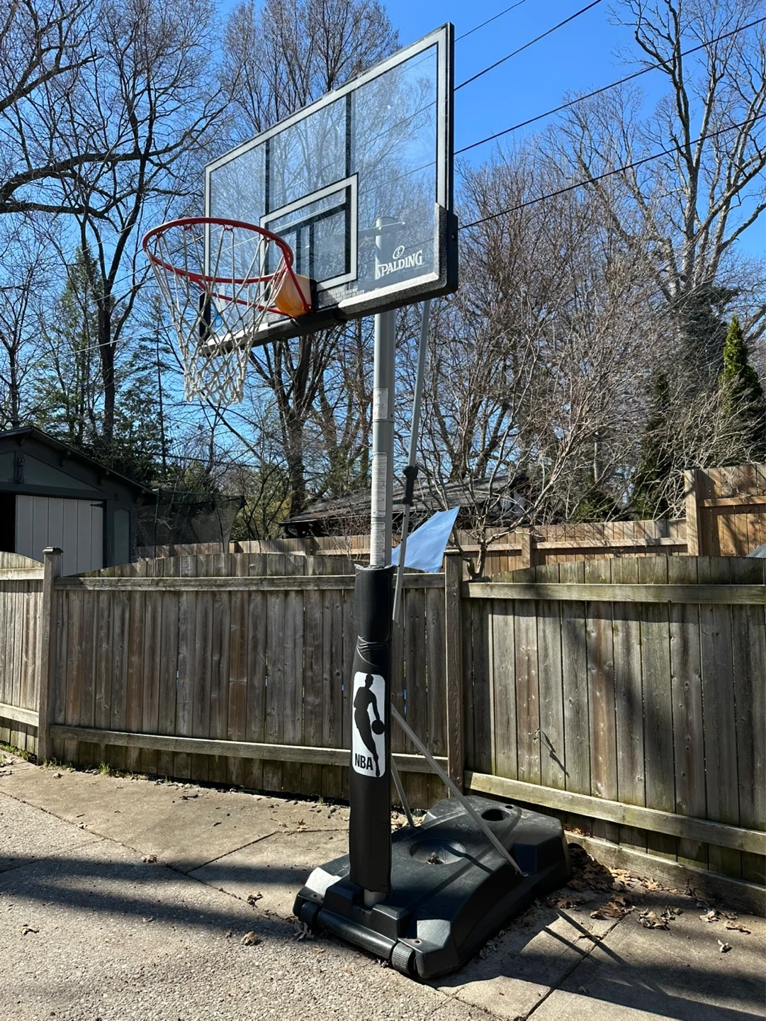 This Spalding portable basketball hoop features a clear backboard and a durable net. The pole is adjustable from 7.5 - 10 ft and the base can be filled with water or sand for stability. It's great for backyard games and practice!
