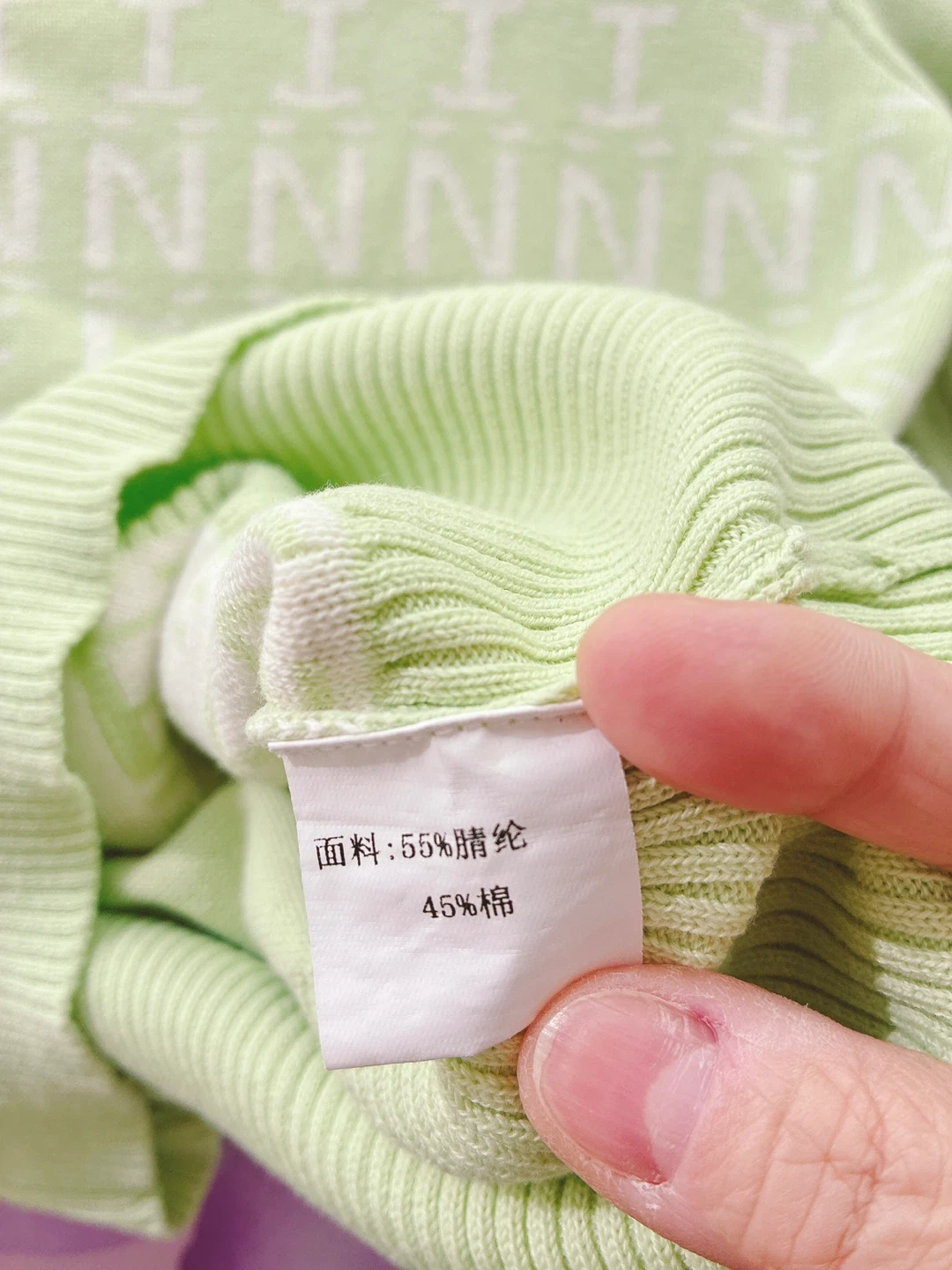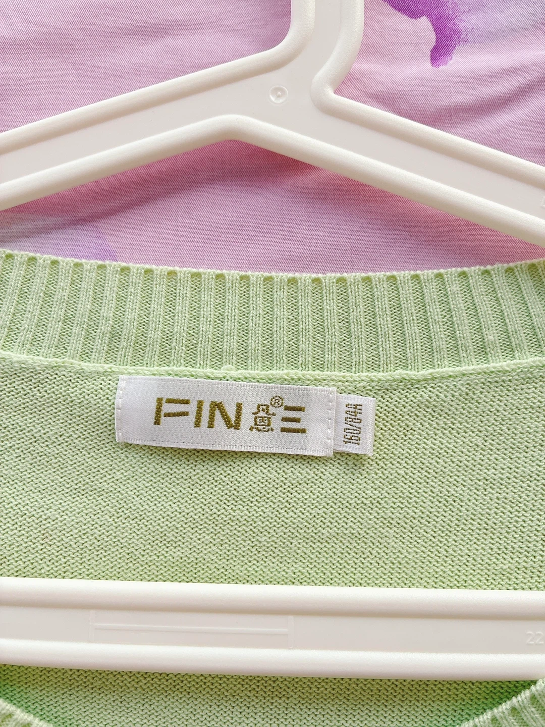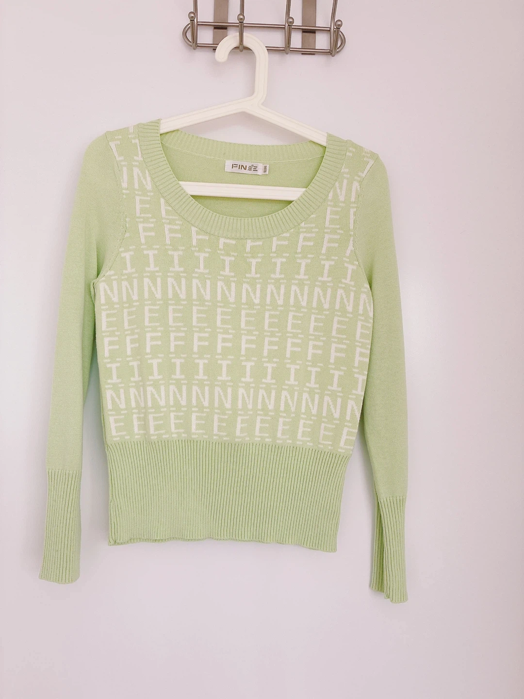Light green Fine brand sweater with a repeating white letter pattern. Made of 55% acrylic and 45% cotton. Size 160/84A. It's comfy and stylish!