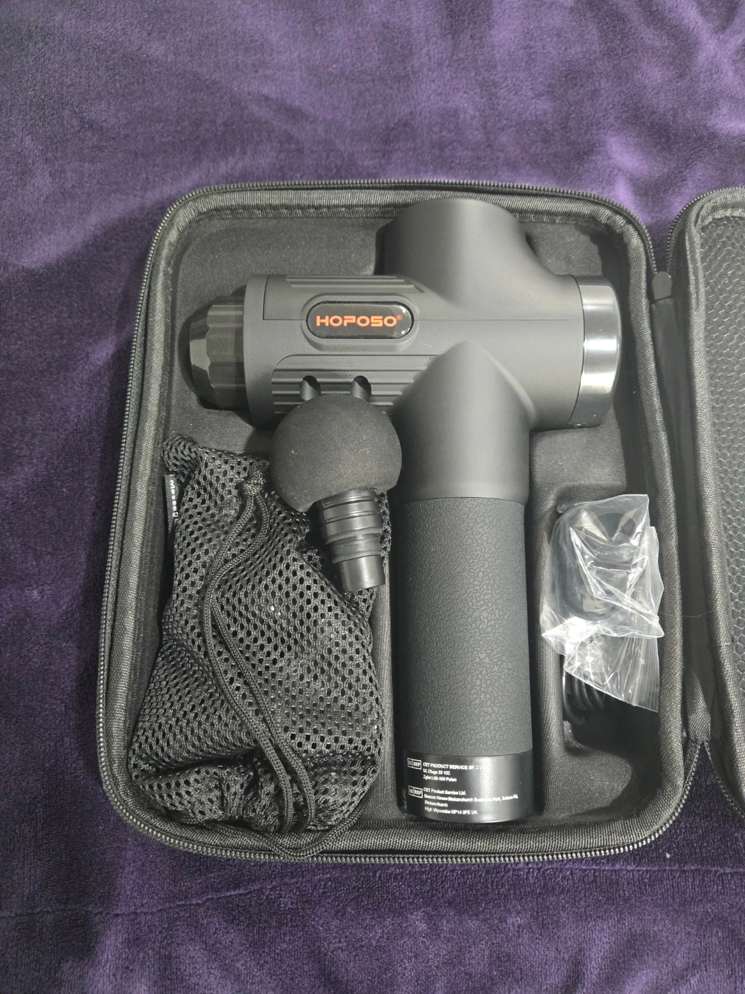 HOPOOS massage gun in a zippered carrying case. Includes various massage heads and charger. Great for post-workout recovery!
