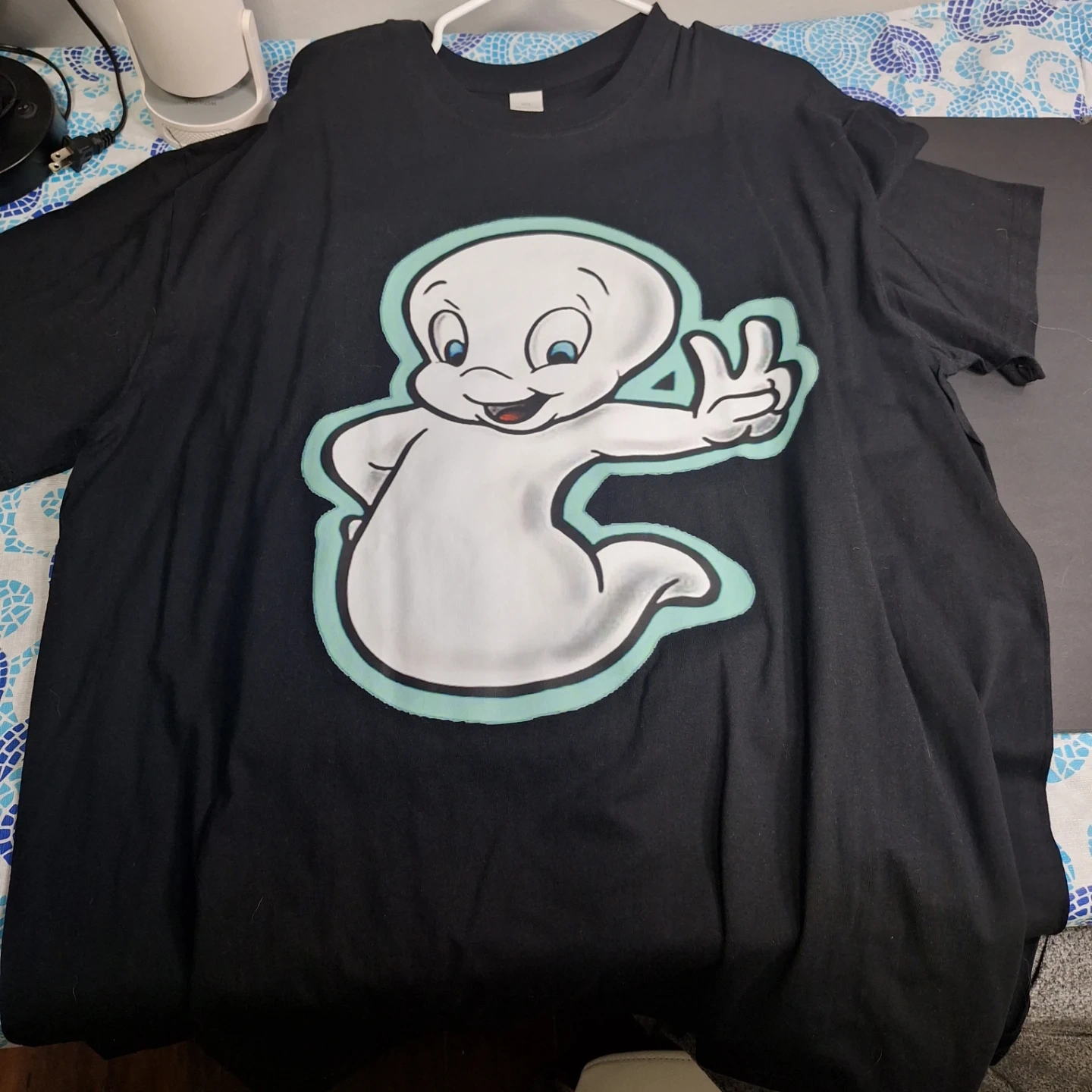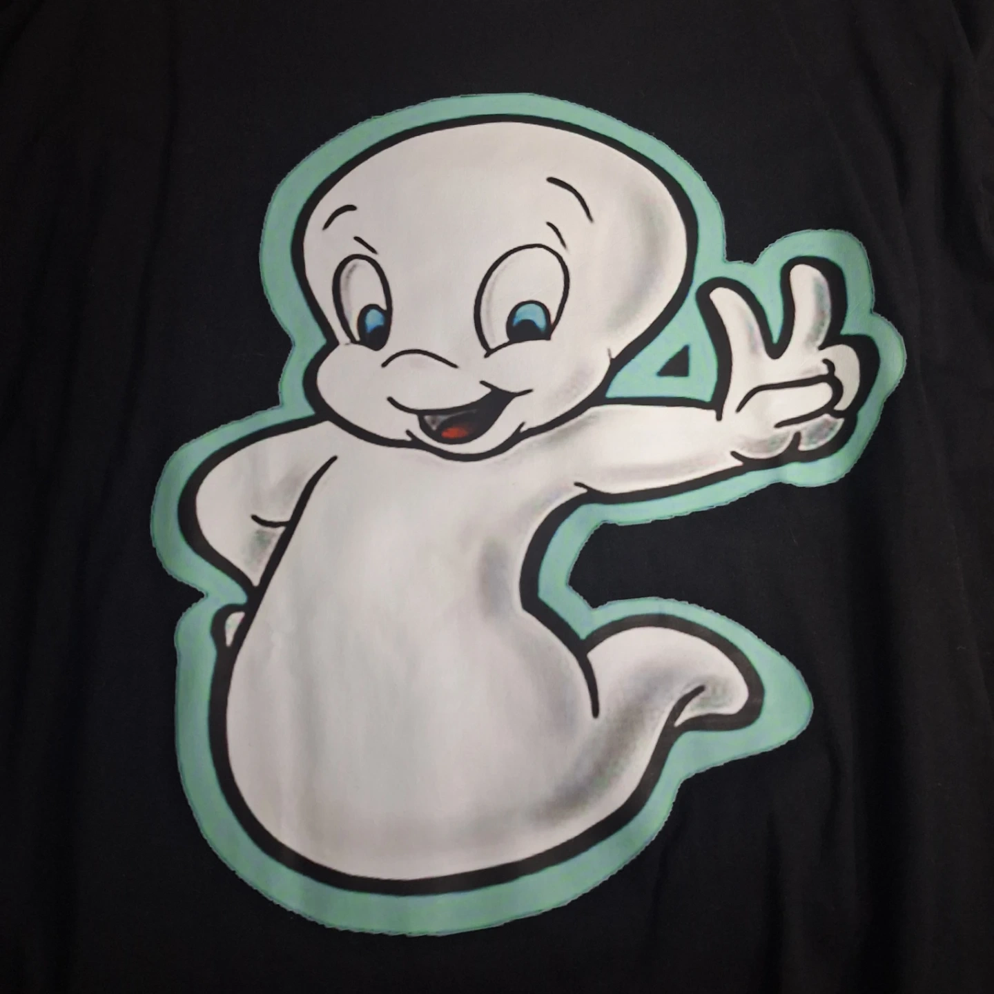 Black t-shirt with a graphic of Casper the Friendly Ghost. It's 3XL size and made of 100% cotton. Perfect for fans of classic cartoons!