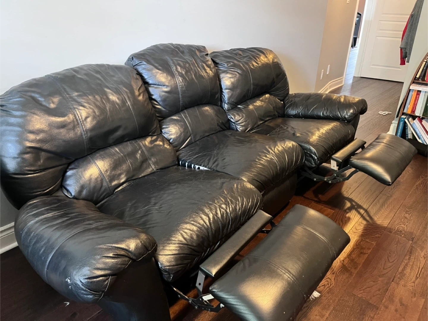 Comfortable black leather reclining sofa and matching armchair. The sofa has three seats, and the armchair has one seat. All seats recline with extendable footrests. Leather material.
