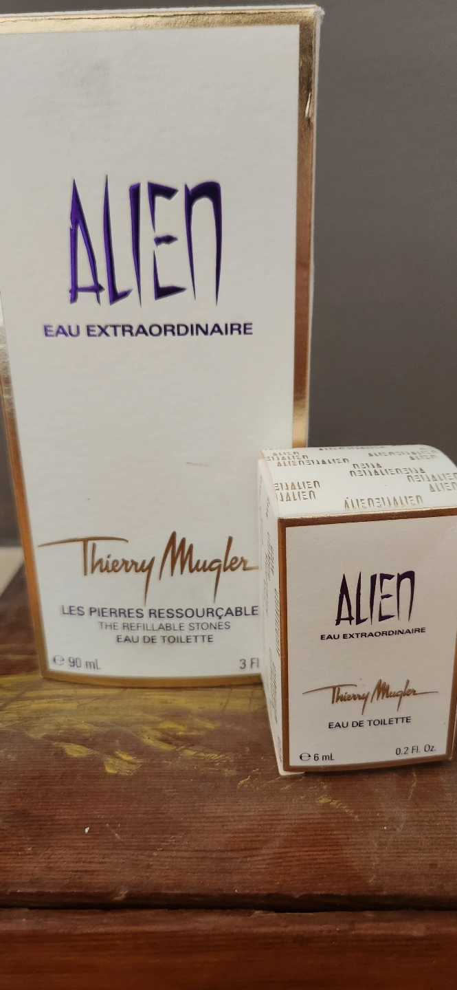 Large and small bottles of Thierry Mugler Alien perfume. Gold accents. Unique shape. Check images for details. Both bottles almost full. I found the boxes too!
