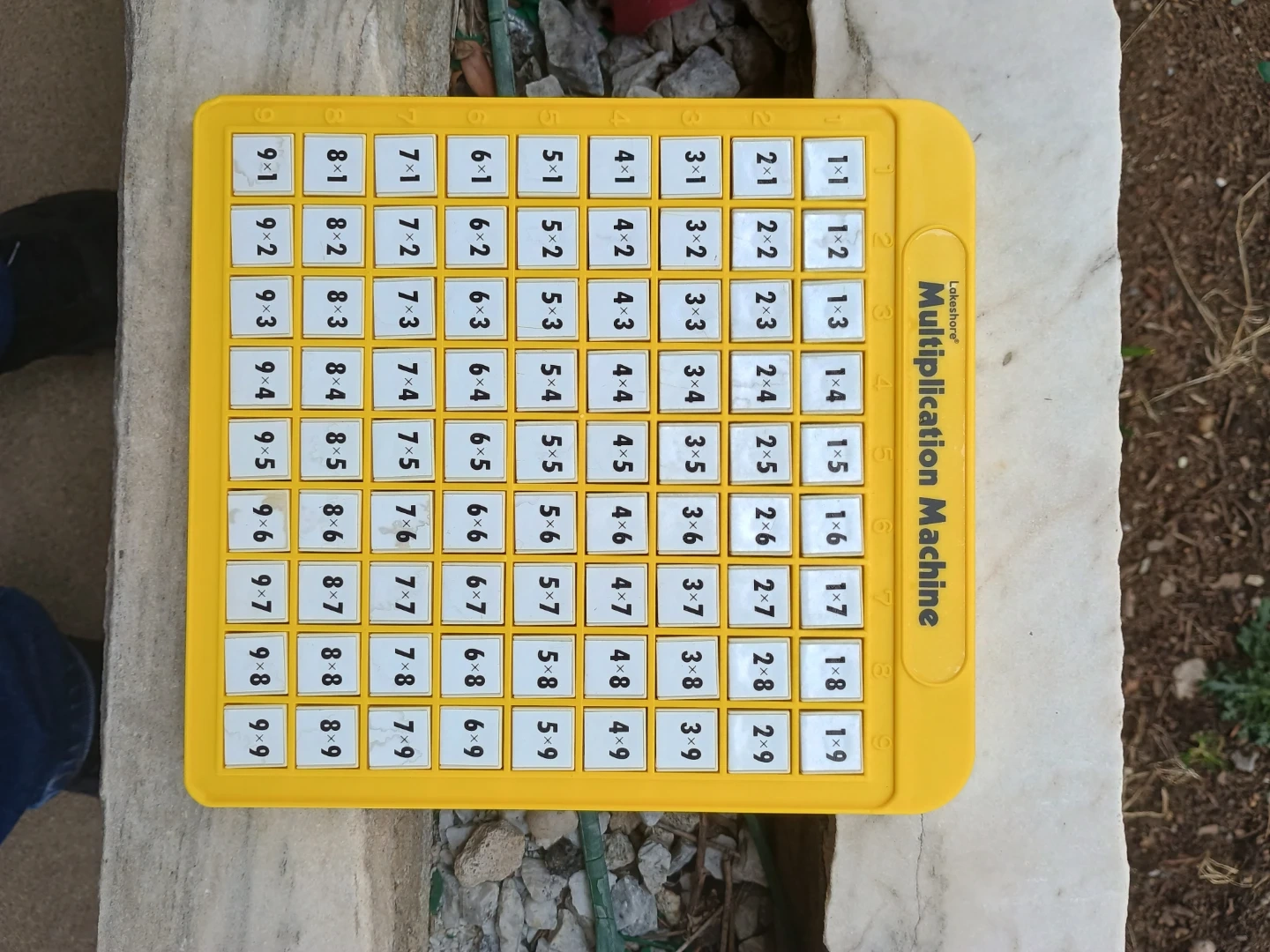 This is a Lakeshore Multiplication Machine. It's yellow and features a multiplication grid on the front. The back has black circular pegs for practice.