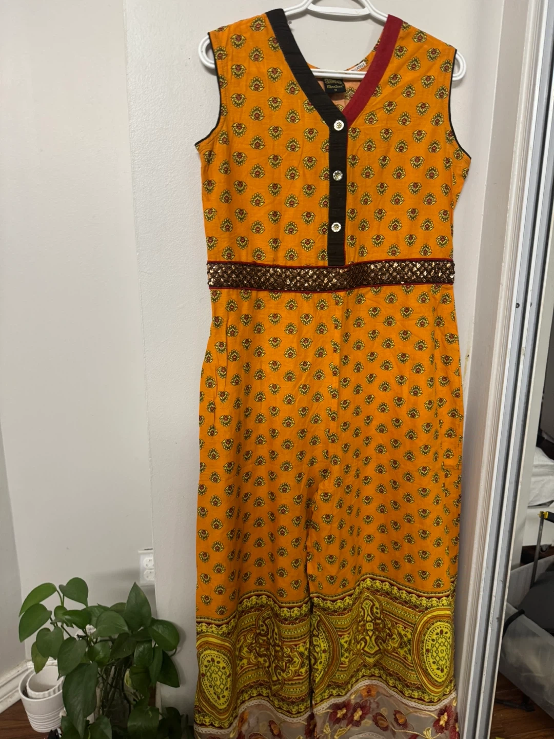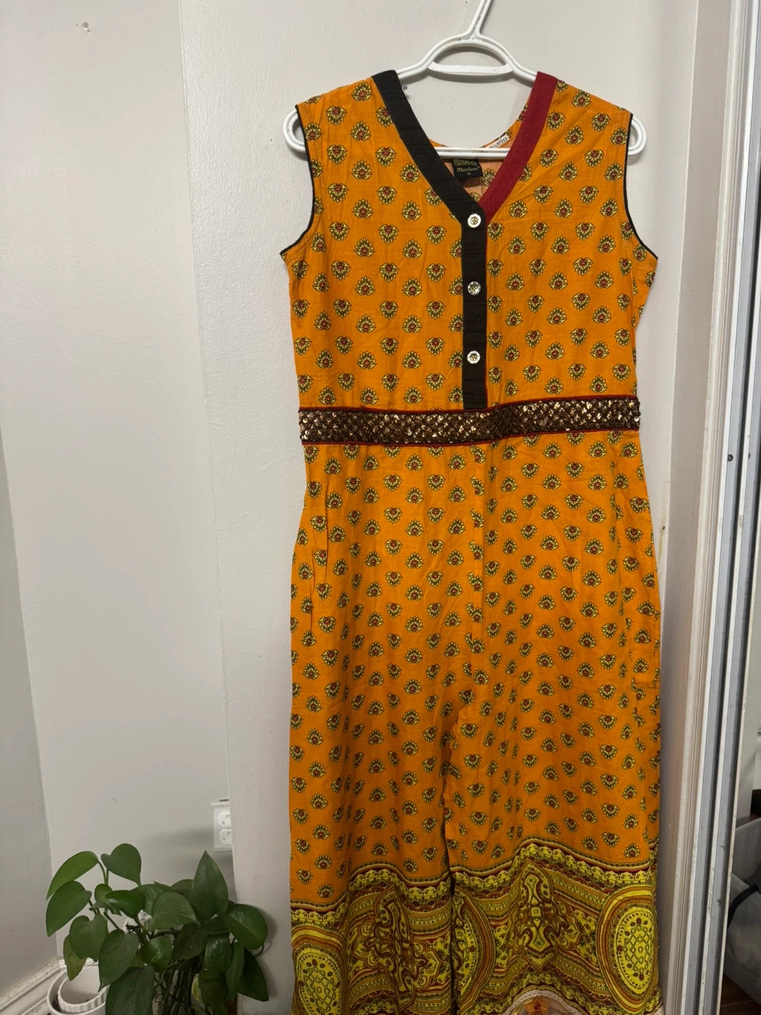 This MissSoni jumpsuit comes in a vibrant orange with a floral print. It features a V-neck with button details and a sequined waist accent. Size medium. Perfect for a casual day out or a stylish evening!
