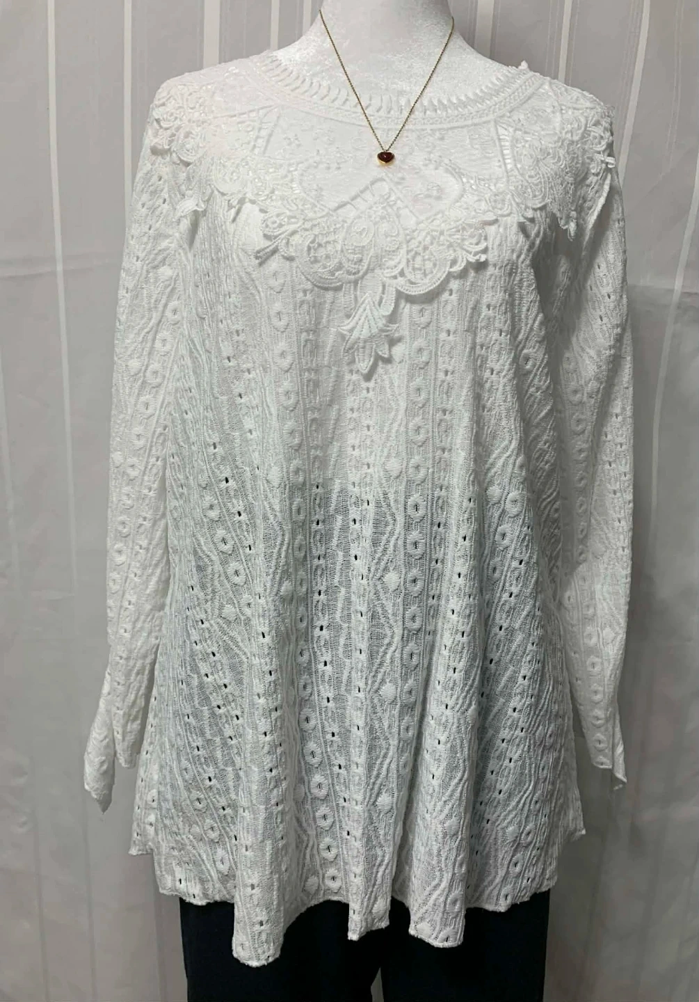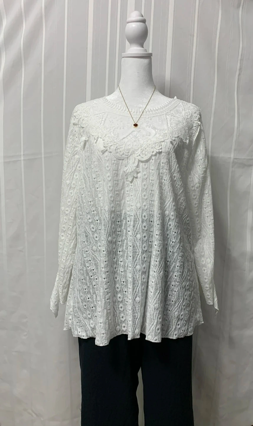 A beautiful white long-sleeve blouse featuring intricate eyelet lace detailing. It has a classic crew neckline with delicate lace trim around the collar. Made with a lightweight fabric, it's perfect for warmer weather or layering.