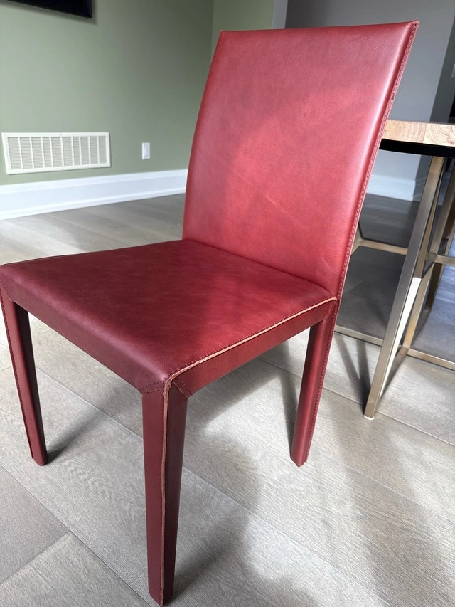 This Crate and Barrel Folio side chair features a sleek, modern design with its striking Merlot leather upholstery. Its clean lines and minimalist frame make it a stylish addition to any dining or living space. This chair is ready to bring a pop of colour and contemporary flair to your home. Brand: Crate and Barrel, Model: Folio Side Chair, Upholstery: Genuine Leather, Colour: Merlot, Style: Modern, Minimalist. These were staging furniture and need to go. Total of 4 available. Each chair is $600. Bundle price is available. Very easy to match your house style and super durable. This chair is looking for a new home. If the ad is up, it's still available!