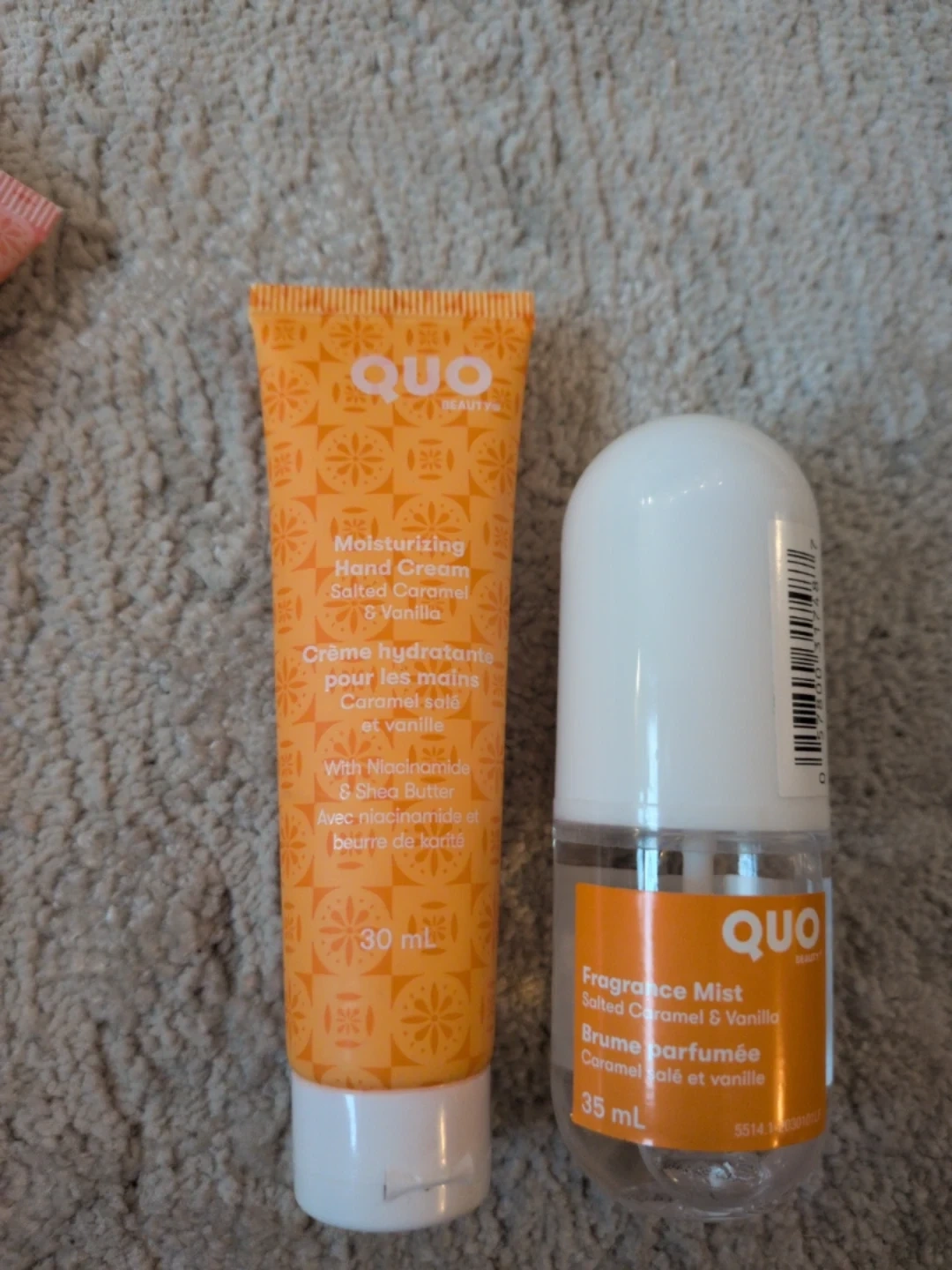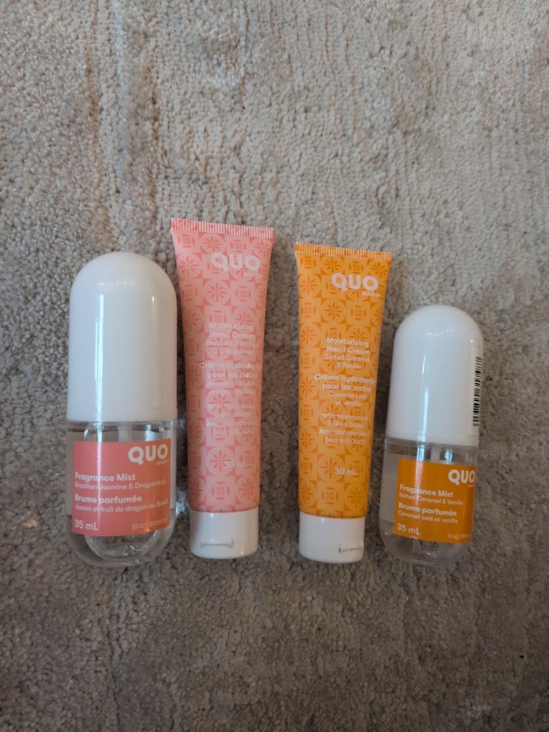 QUO Beauty Moisturizing Hand Cream in Salted Caramel & Vanilla, 30ml. QUO Beauty Fragrance Mist in Salted Caramel & Vanilla, 35ml. QUO Beauty Moisturizing Hand Cream in Brazilian Jasmine & Dragonfruit, 30ml. QUO Beauty Fragrance Mist in Brazilian Jasmine & Dragonfruit, 35ml. These travel-sized sets are great for on-the-go refreshers!