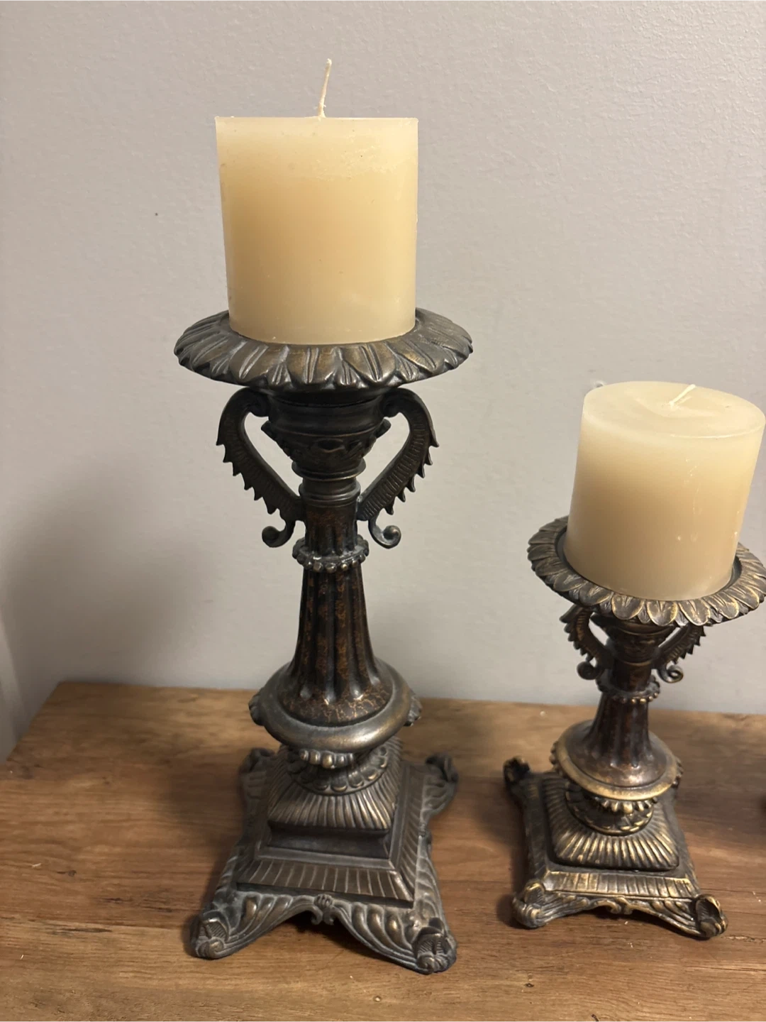 Three decorative candle holders in an antique bronze finish. They feature intricate detailing and a tiered base. These holders would add a touch of elegance to any room.