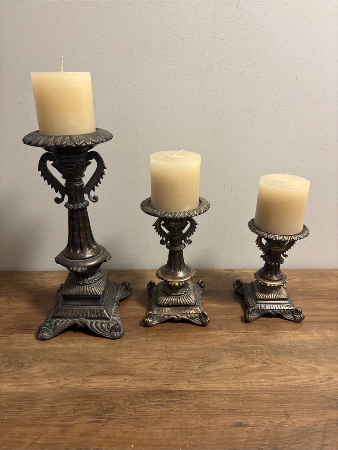 Three decorative candle holders in an antique bronze finish. They feature intricate detailing and a tiered base. These holders would add a touch of elegance to any room.