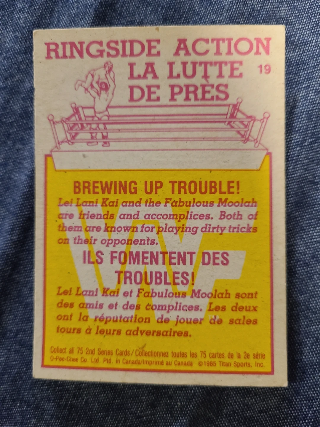 This is a trading card featuring Lei Lani Kai and The Fabulous Moolah. The card is from the 2nd series and was printed in Canada in 1985. It's part of a collection of 75 cards.