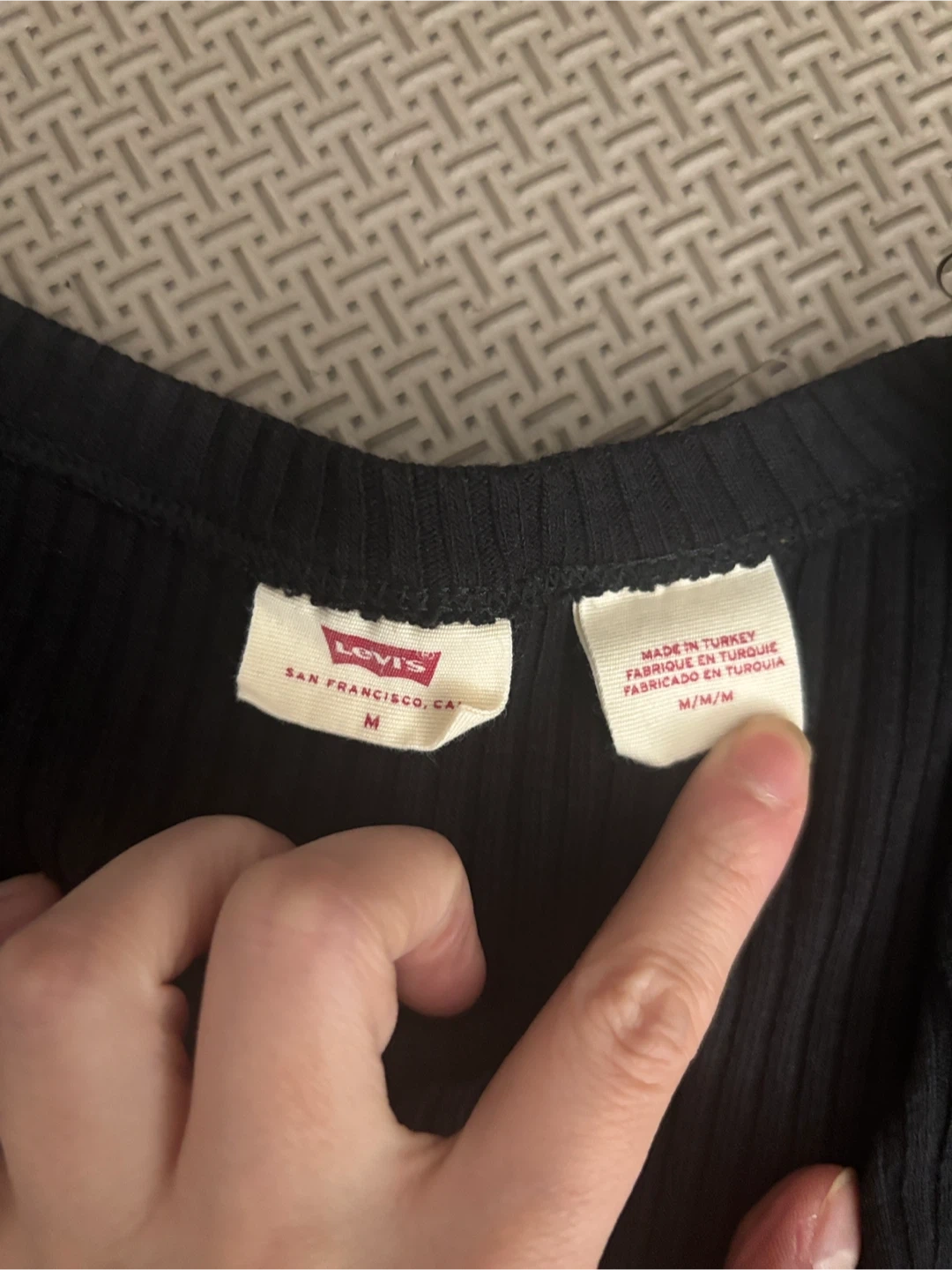 This is a black ribbed wrap long sleeve top from Levi's. It's a size medium. Made in Turkey. It has tie closures.