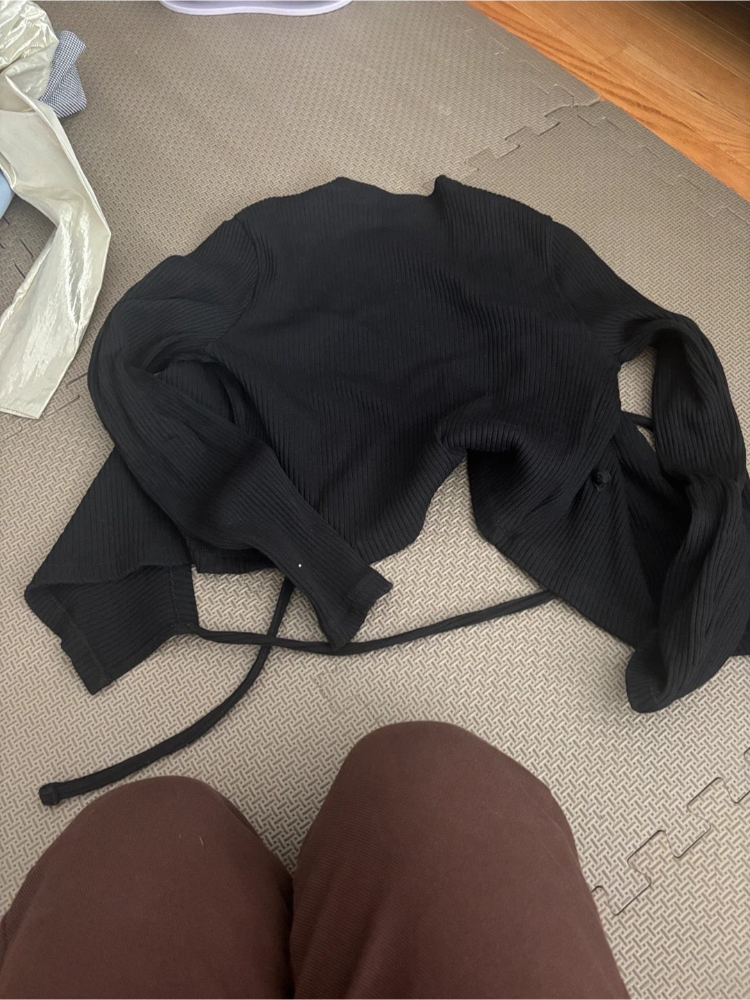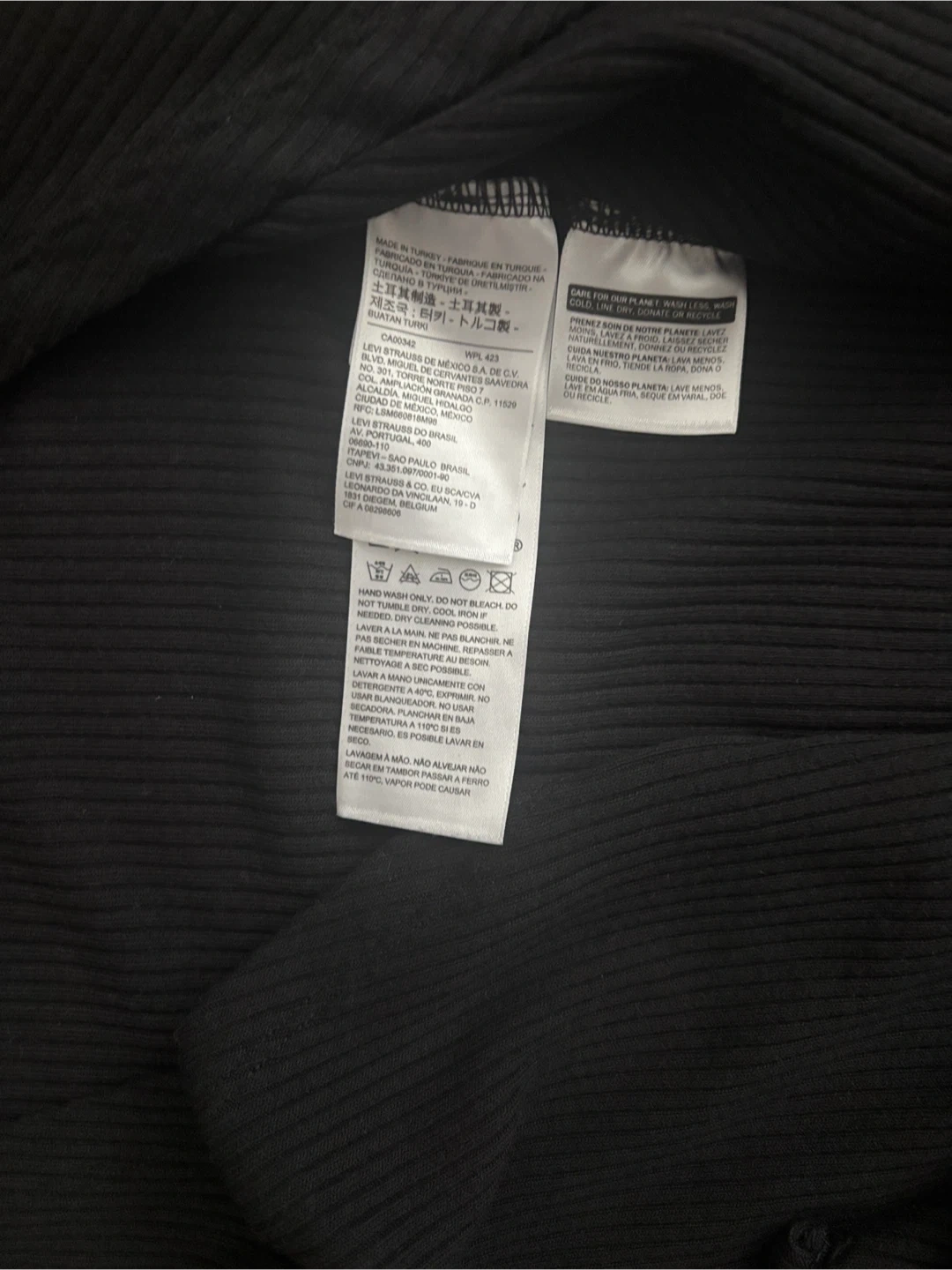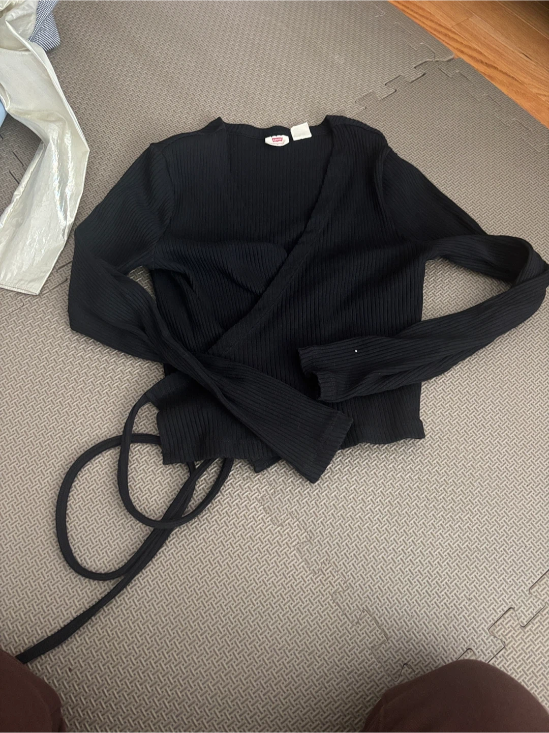 This is a black ribbed wrap long sleeve top from Levi's. It's a size medium. Made in Turkey. It has tie closures.