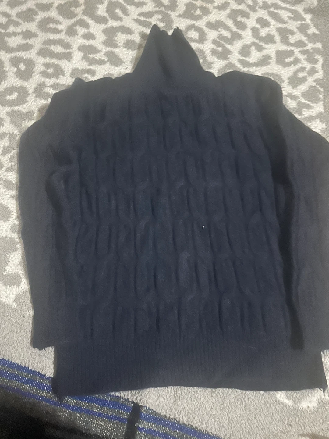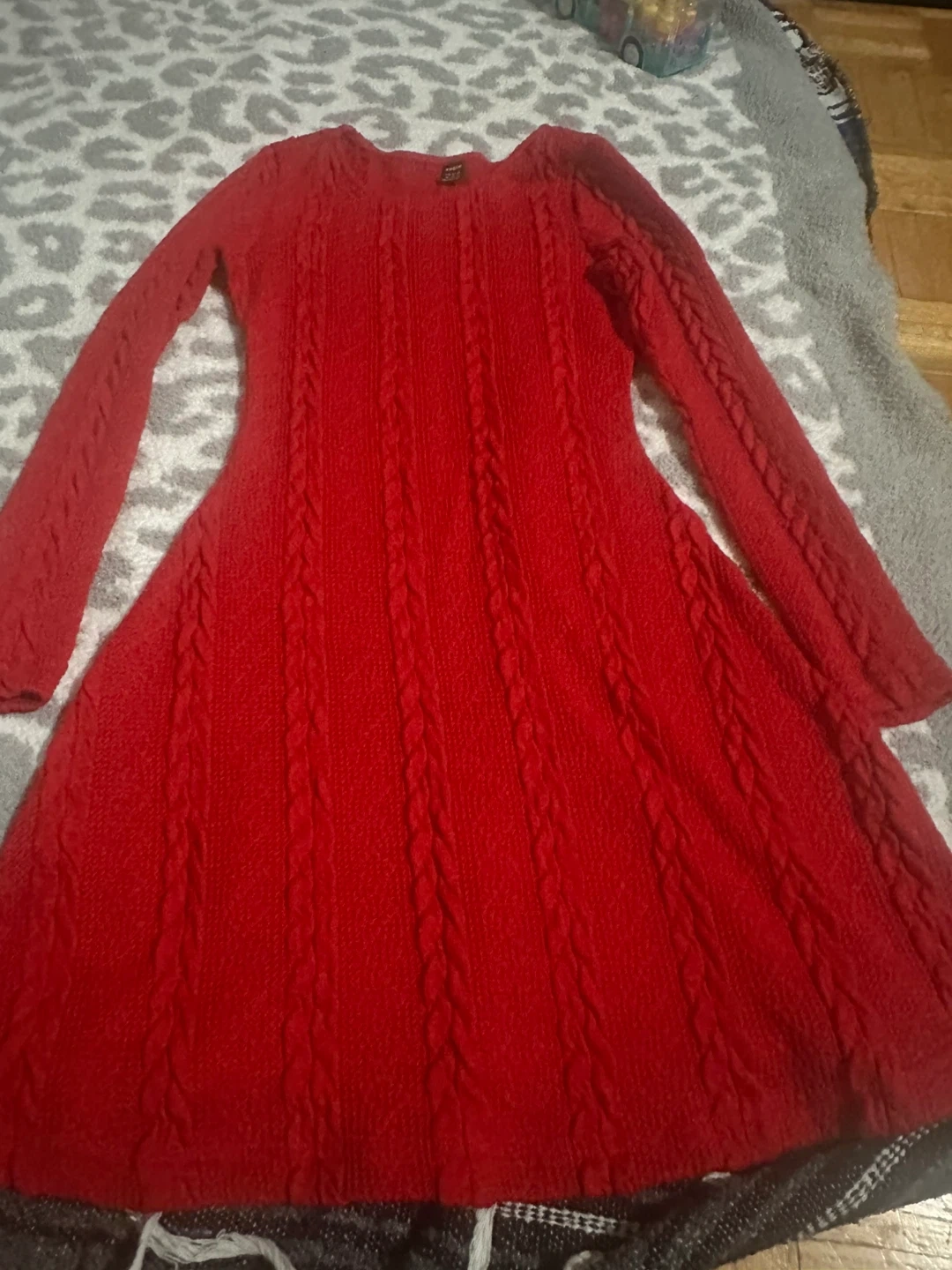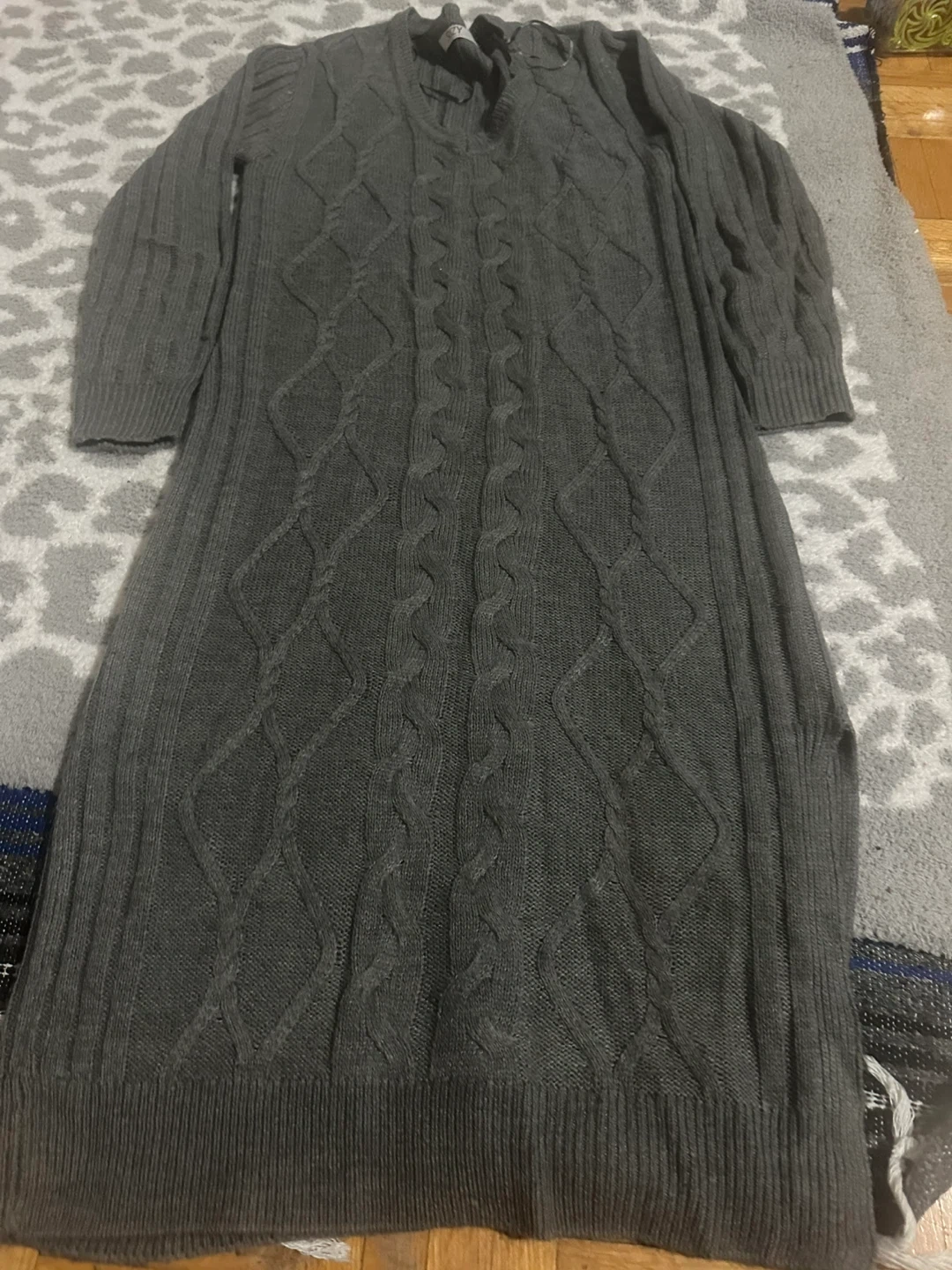 Assorted women's sweater dresses. Includes a grey cable knit midi dress, a striped puff-sleeve sundress, a navy cable knit turtleneck sweater dress, a brown ribbed knit maxi dress, and a black and white face print sweater dress. Various styles and materials are featured.
