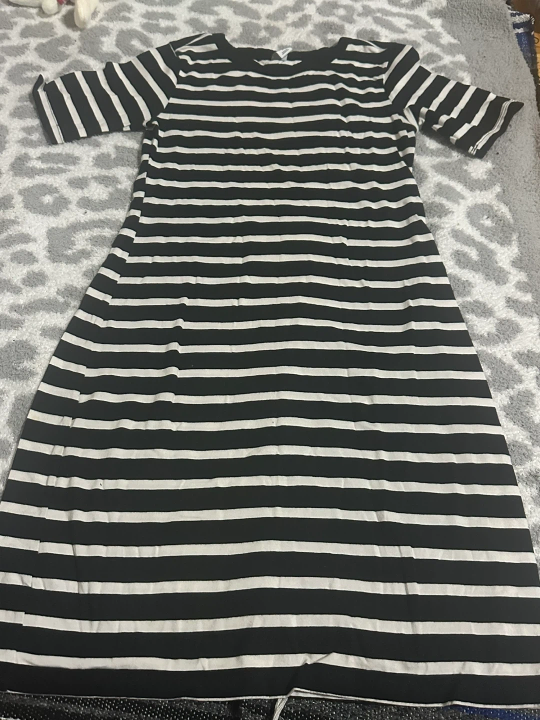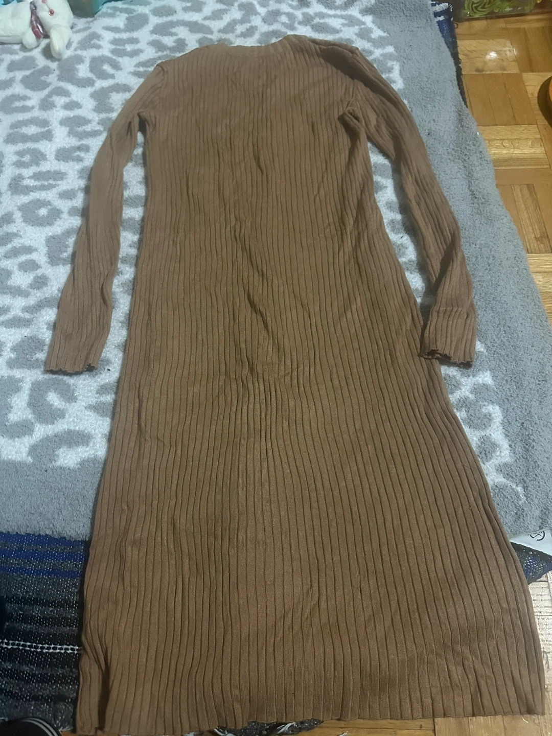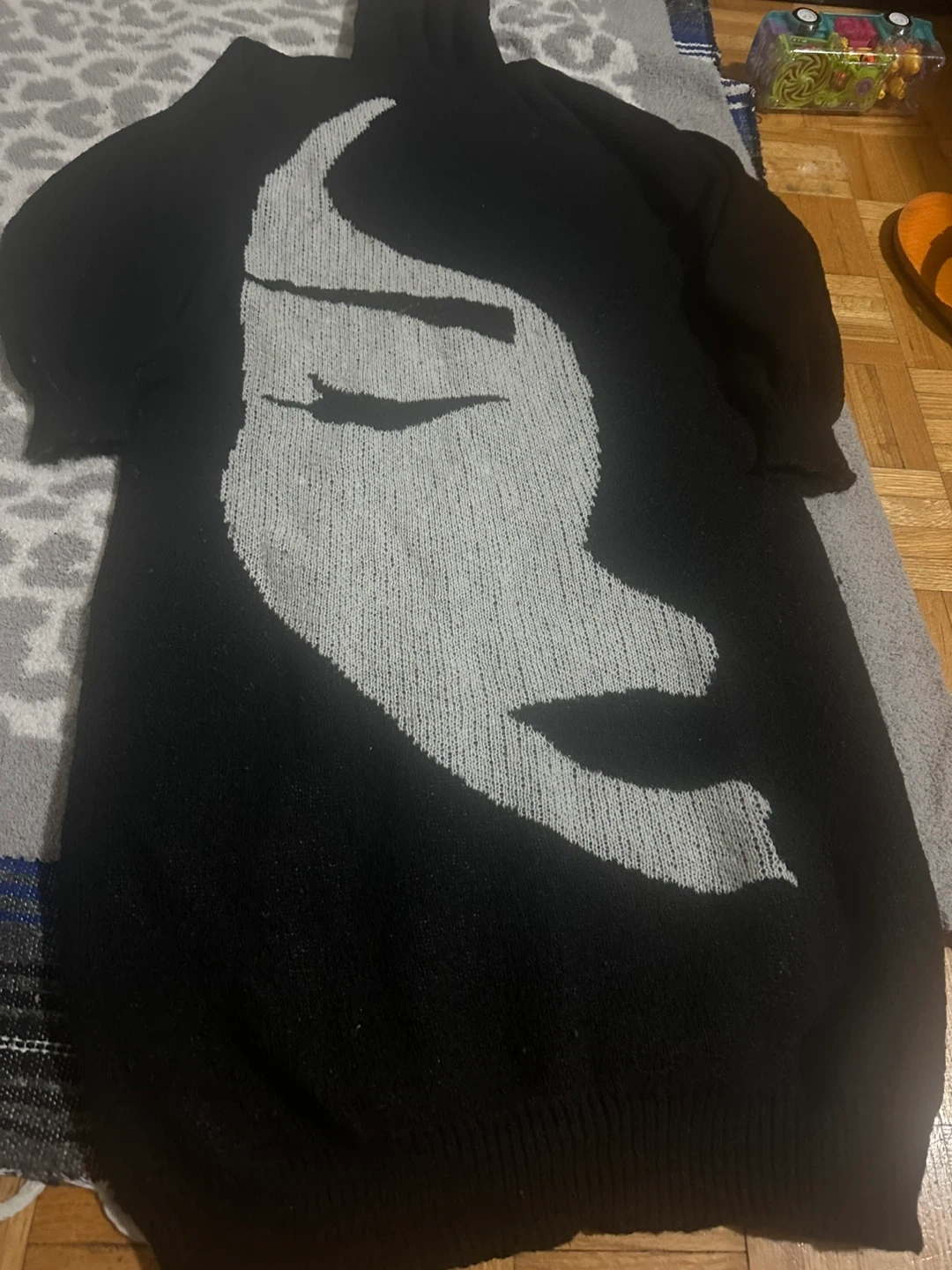 Assorted women's sweater dresses. Includes a grey cable knit midi dress, a striped puff-sleeve sundress, a navy cable knit turtleneck sweater dress, a brown ribbed knit maxi dress, and a black and white face print sweater dress. Various styles and materials are featured.