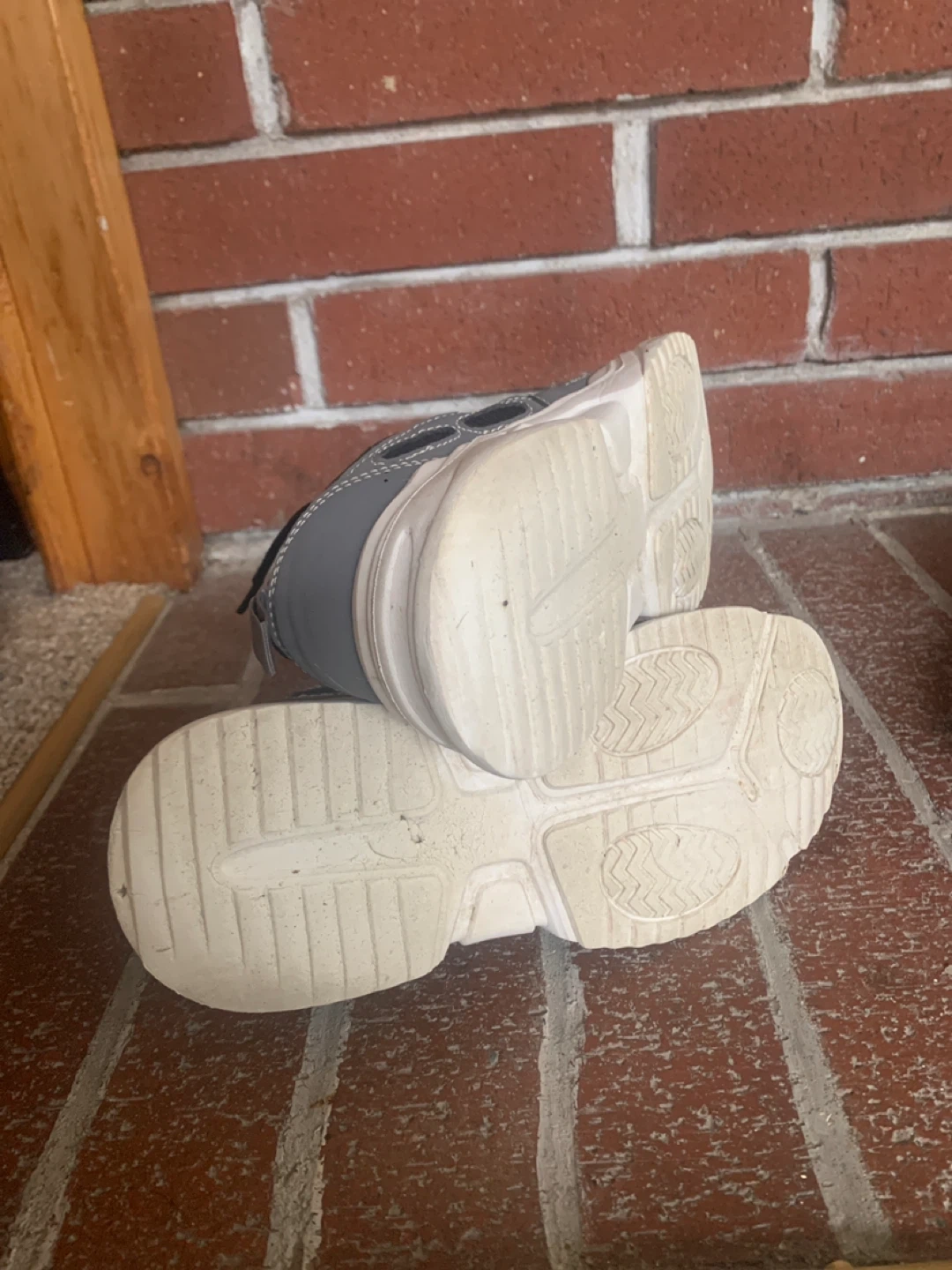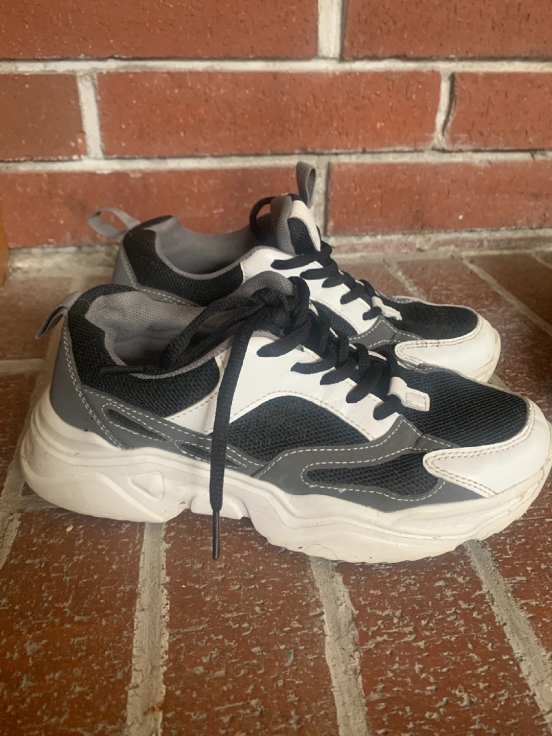 These athletic shoes are a mix of grey, white, and black. They feature a durable rubber sole. Perfect for everyday wear and light athletic activities.size: 6-6.5