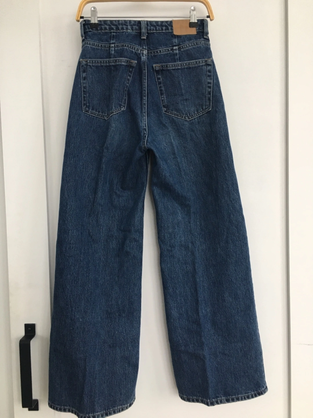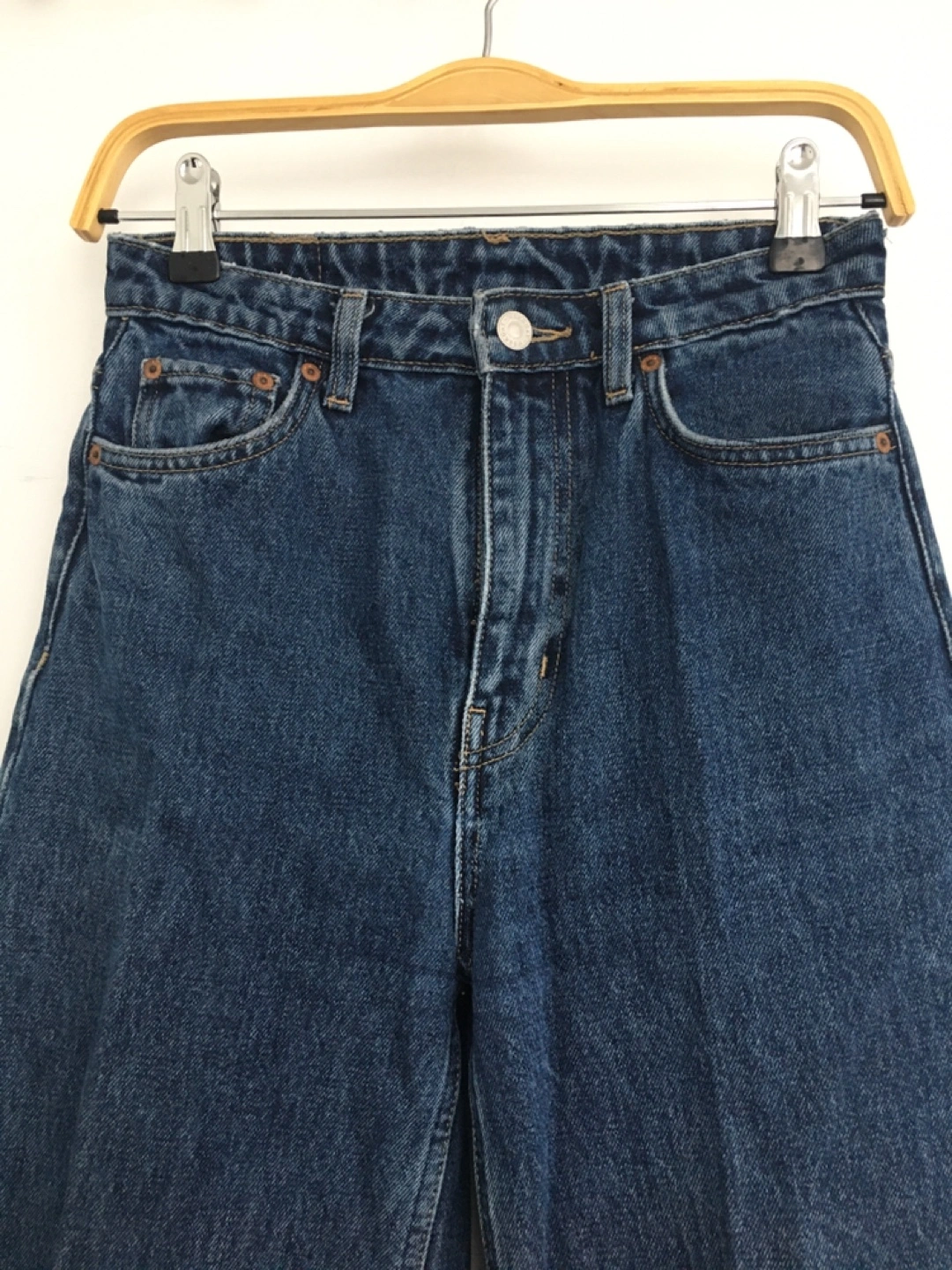 These are Weekday Ace wide leg jeans in a classic blue wash. They're a size 24/30, made from durable denim. High waisted fit.