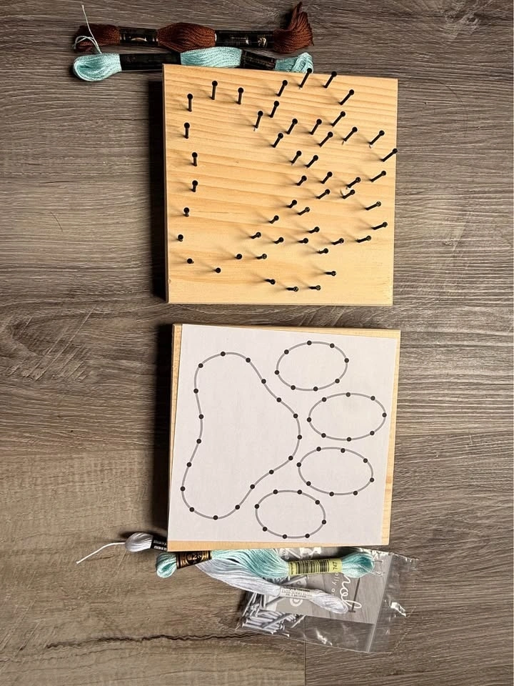 DIY String Art Craft Kit. Includes wooden boards with nails pre-installed and embroidery thread to create decorative string art designs. Great for crafts, DIY decor, or a fun project. Includes: 2 wooden nail boards, Colored embroidery thread, Pattern guide, Original packaging. Pickup in Welland.