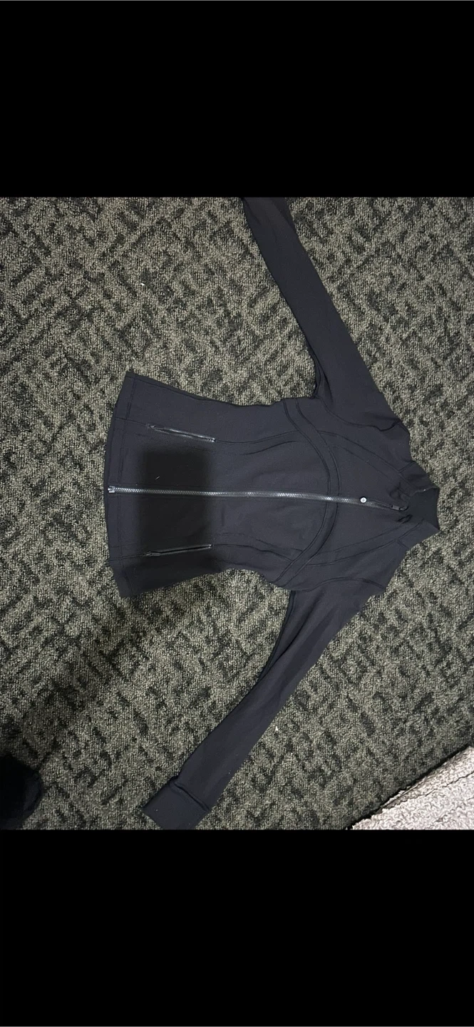 This is a Lululemon zip-up jacket in black. It's made with a comfortable, stretchy fabric perfect for workouts or casual wear. Features zippered pockets for secure storage. Zip-up style offers adjustable ventilation.