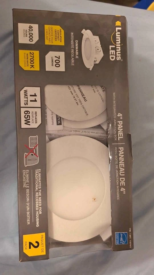 Brand new, open box Luminus 4-inch LED Recessed Panel lights. This is a 2-pack kit that includes everything needed for a clean, modern look without the need for bulky "can" housing. Perfect for basements, kitchens, or any room with tight ceiling space. Model: PPS144 (2-Pack). Condition: Brand New (Open Box - verified contents). Brightness: 700-800 Lumens (Energy efficient, replaces 65W bulbs). Color: Warm White (Sleek, cozy 2700K–3000K glow). Features: Fully dimmable and IC Rated (safe for direct contact with insulation). Easy Install: Includes junction boxes with push-in wire connectors for fast setup. No ground wire required—perfect for older homes! Payment: Cash only. Pickup: Markham Rd and 401 (Scarborough).