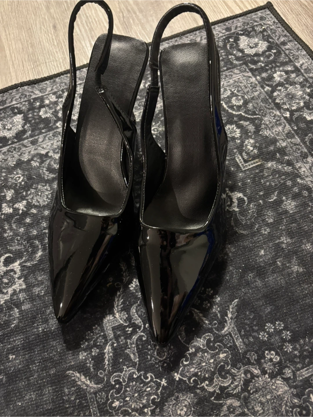 A pair of brand new sleek black patent slingback heels. These shoes feature a pointed toe and a comfortable heel height. They're perfect for dressing up any outfit for a night out or a special occasion!