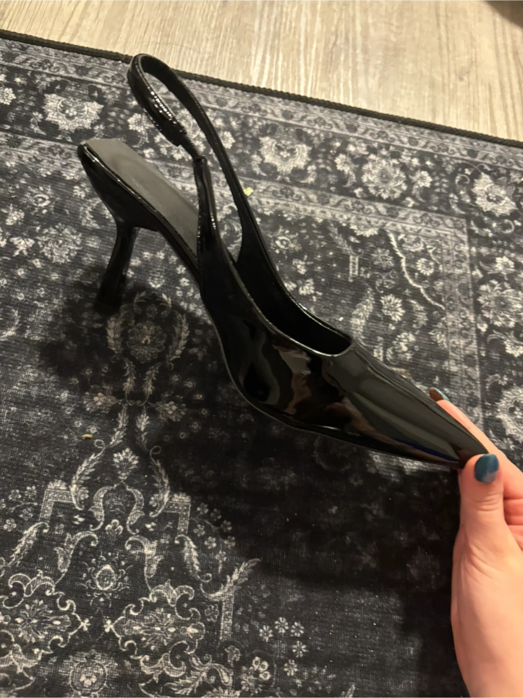 A pair of brand new sleek black patent slingback heels. These shoes feature a pointed toe and a comfortable heel height. They're perfect for dressing up any outfit for a night out or a special occasion!