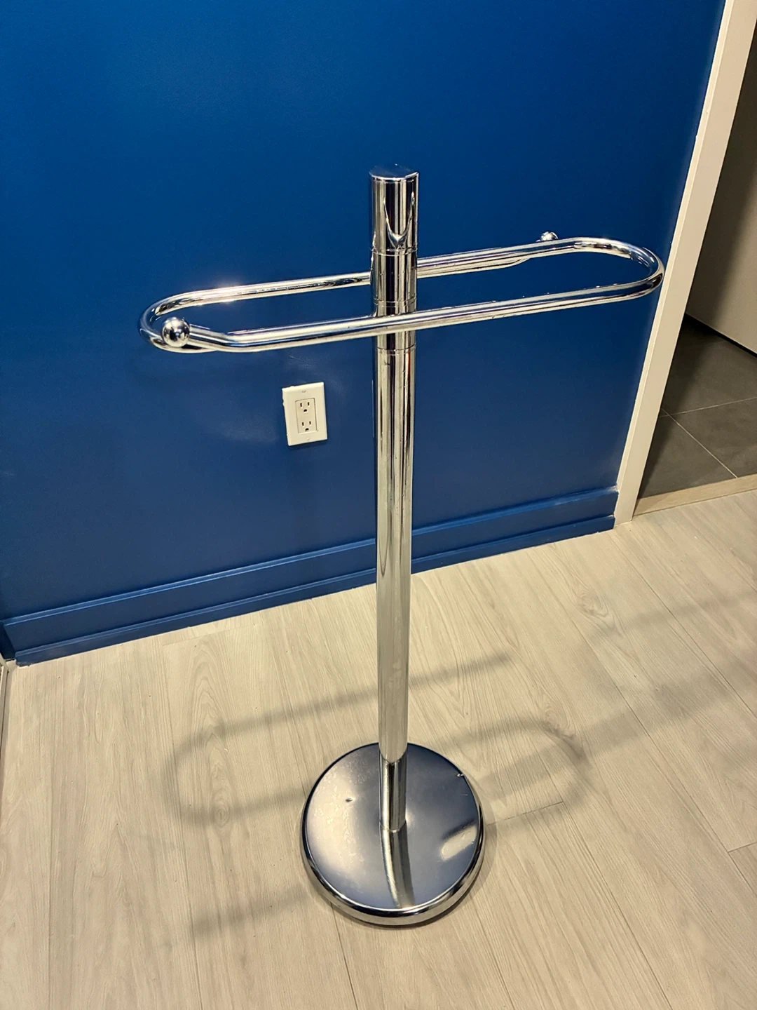 Here's a chrome towel rack stand in great condition! (Just a couple small cosmetic dings on the base). It has a weighted base and the racks can rotate. It's perfect for keeping your towels organized and adding a touch of modern style to your bathroom.